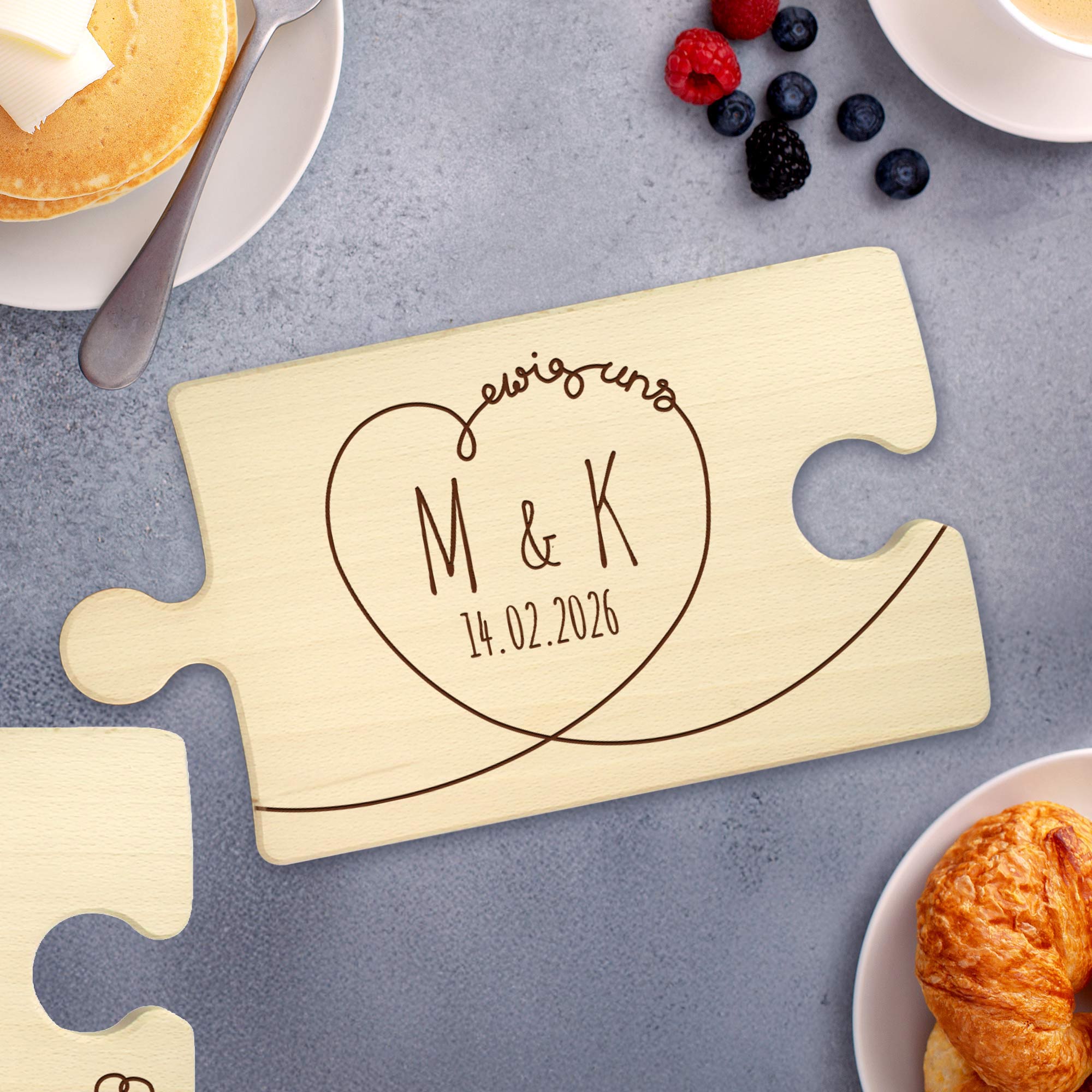 Manchmal passen zwei Menschen einfach zueinander wie zwei Puzzleteile die viel zu lange ohne einander waren. Das 2er Set Puzzlebretter soll genau das symbolisieren - und ist dazu noch praktisch. Die hochwertigen Holzbretter sind ideal zur Zubreitung einer gemeinsamen Mahlzeit, eignen sich aber auch sehr gut als Servierbretter. Der romantische Spruch "Ewig dein - ewig mein - ewig uns" und die individuelle Gravur der Initialen und eines Datums macht die Schneidebretter zu einem persönlichen und romantischen Geschenk.