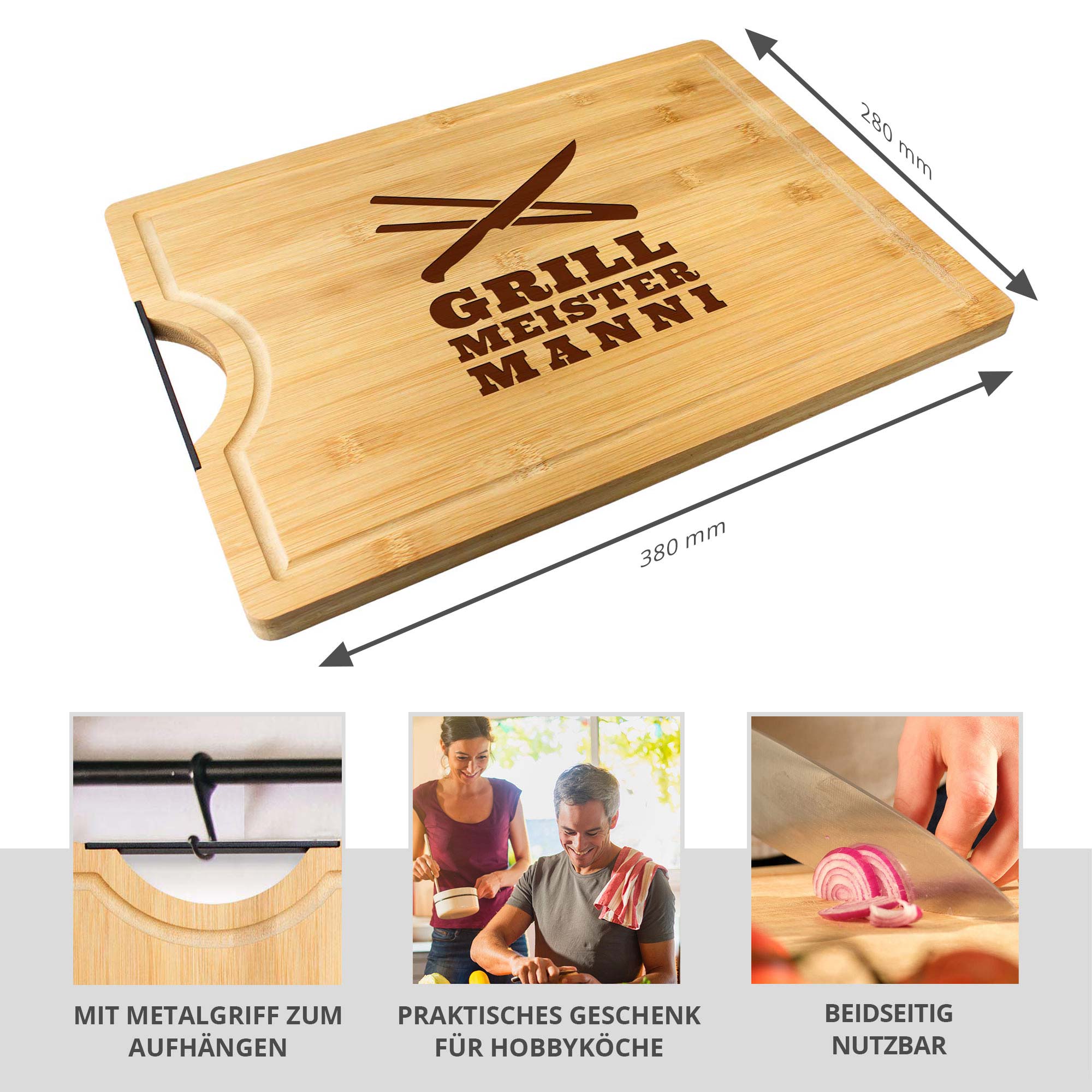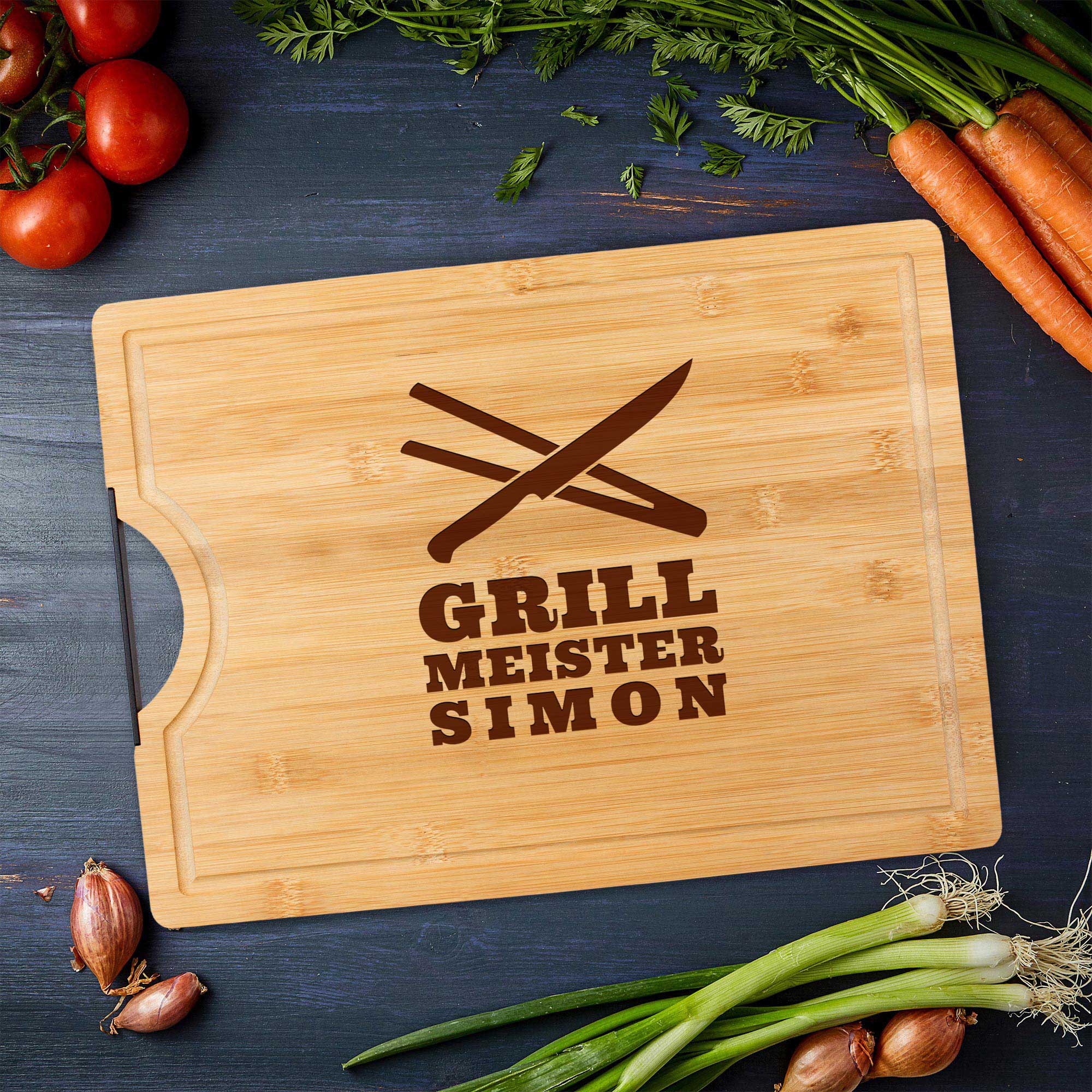 Unser Schneidebrett aus nachhaltigem Bambusholz mit einem stabilen Metallgriff vereint Qualität und Funktionalität auf höchstem Niveau. Mit einer individuellen Grillmeister-Gravur, die den Namen Ihres Lieblingsgrillers trägt, wird dieses Brett zu einem persönlichen Schmuckstück in jeder Grillstation. Die praktische Saftrille sorgt dabei für ein sauberes Arbeitsumfeld und ermöglicht ein müheloses Zubereiten von köstlichen Grillspezialitäten.