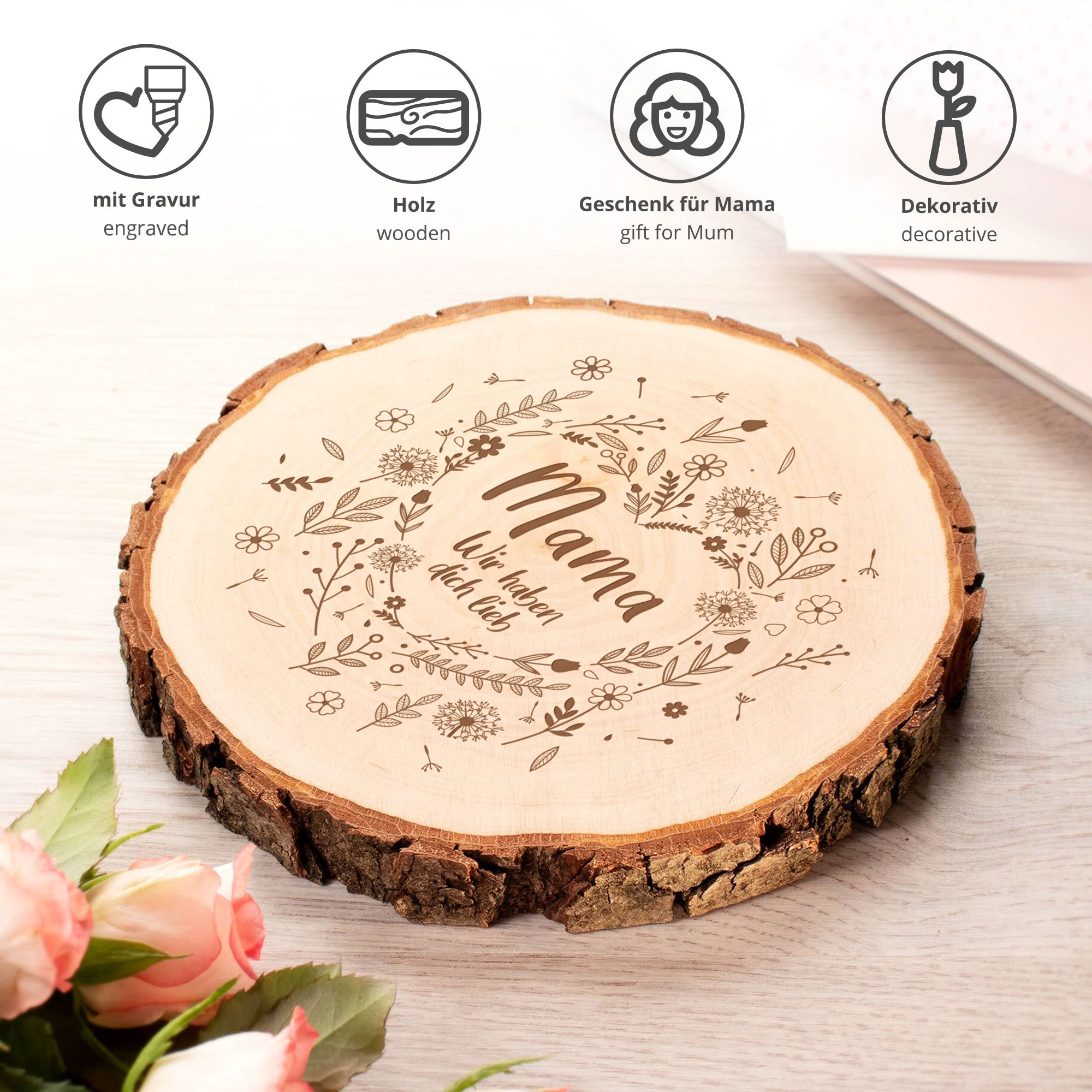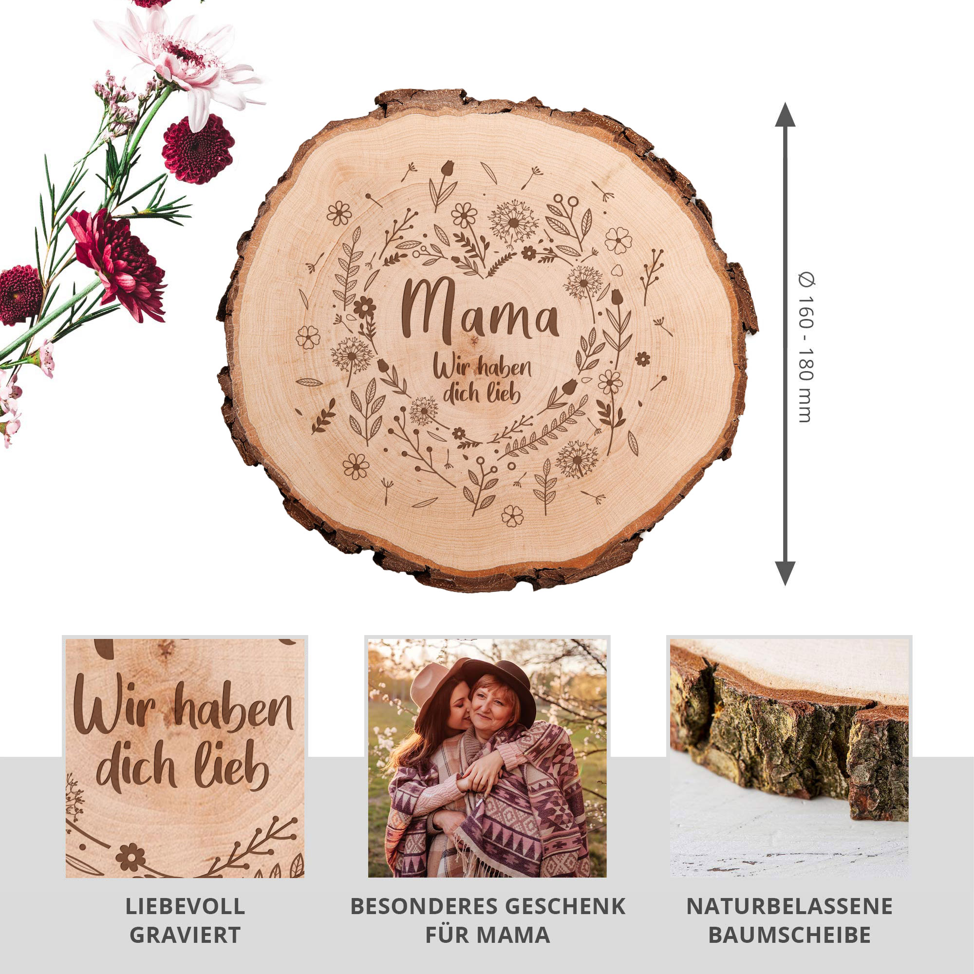 Funktionaler Holzuntersetzer oder außergewöhnliches Tablett: Die Baumscheibe ist ein wahrer Allrounder im schlichten Naturdesign. Die einzigartige Maserung der Rindenscheibe macht die Holzdeko zu einem absoluten Unikat und einer tollen Geschenkidee für Deine Mutter. Die Holz Rundscheibe wird mit einem wundervollen Blumenherz graviert, in dessen Mittelpunkt der Schriftzug "Mama, wir haben Dich lieb" zu lesen ist. Eine besondere Liebesbotschaft für eine hingebungsvolle Mama!
