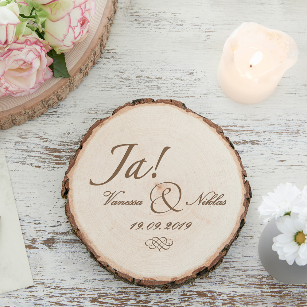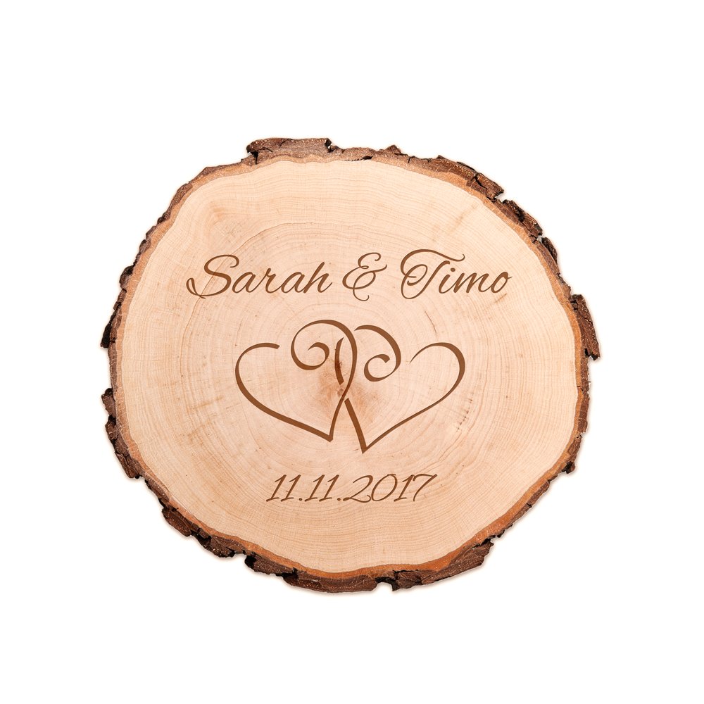 Selbstverständlich ganz individuell: Die schöne Baumscheibe wird mit einem Wunschmotiv graviert sowie mit einem Wunschdatum und den Wunschnamen verziert. So entsteht ein ganz persönliches Geschenk zur Hochzeit, das als rustikale Dekoidee die frisch gebackenen Eheleute sicher noch lange begleiten wird und Ihnen Freude machen.