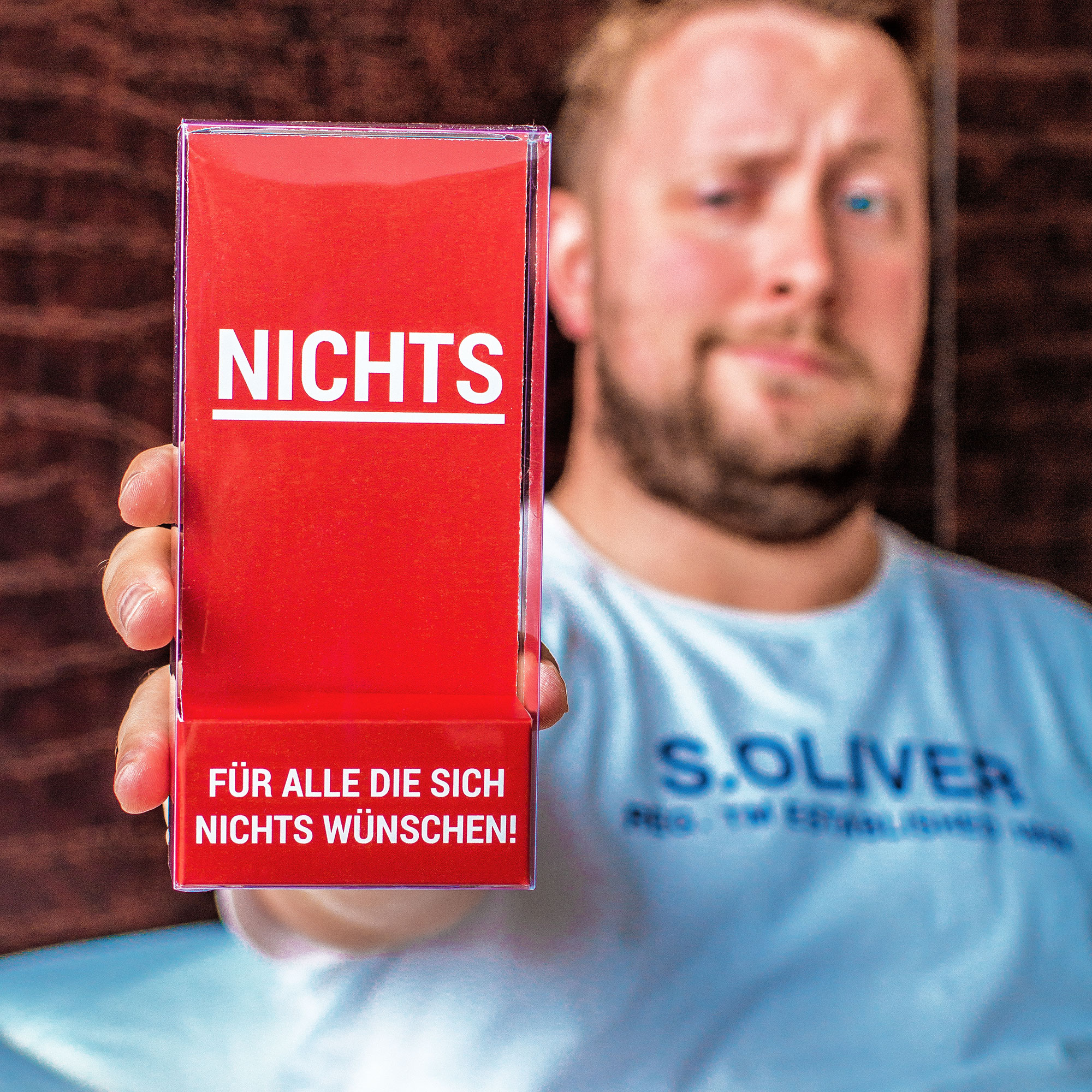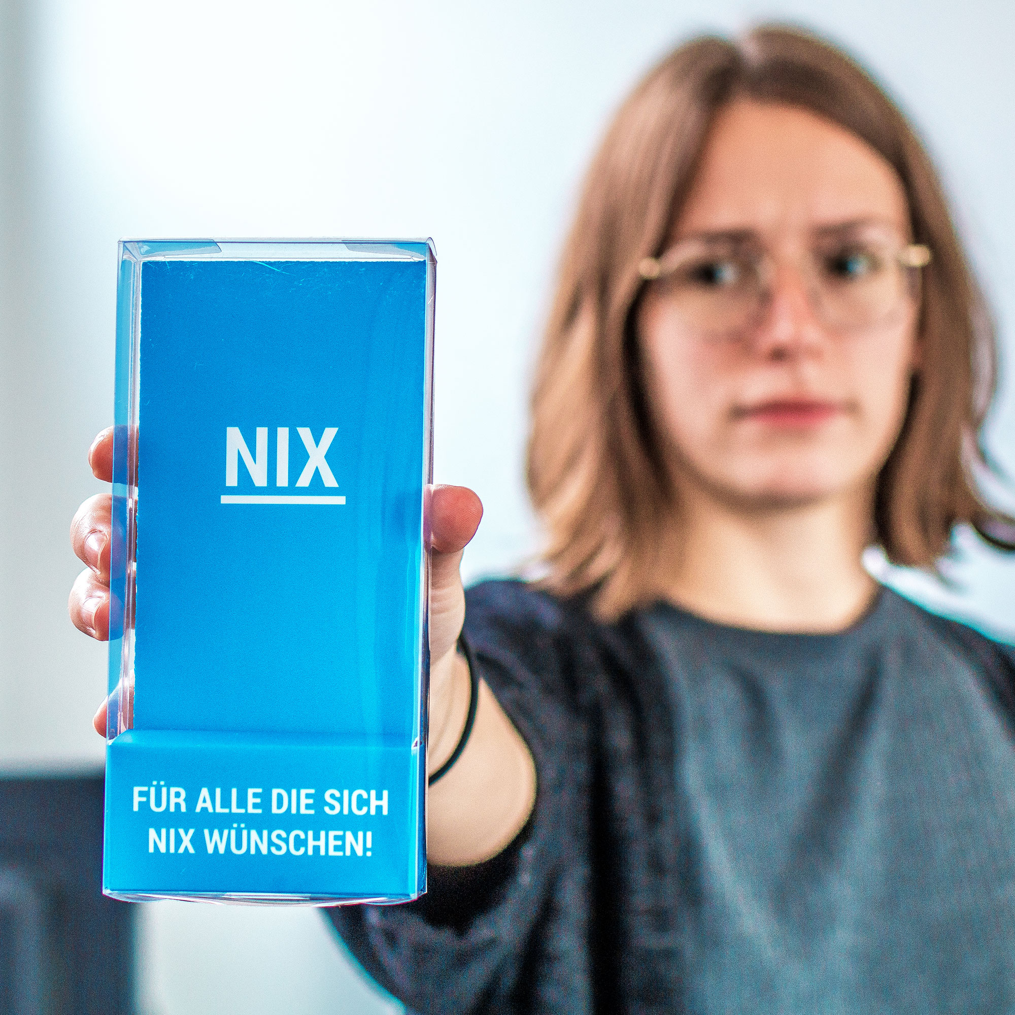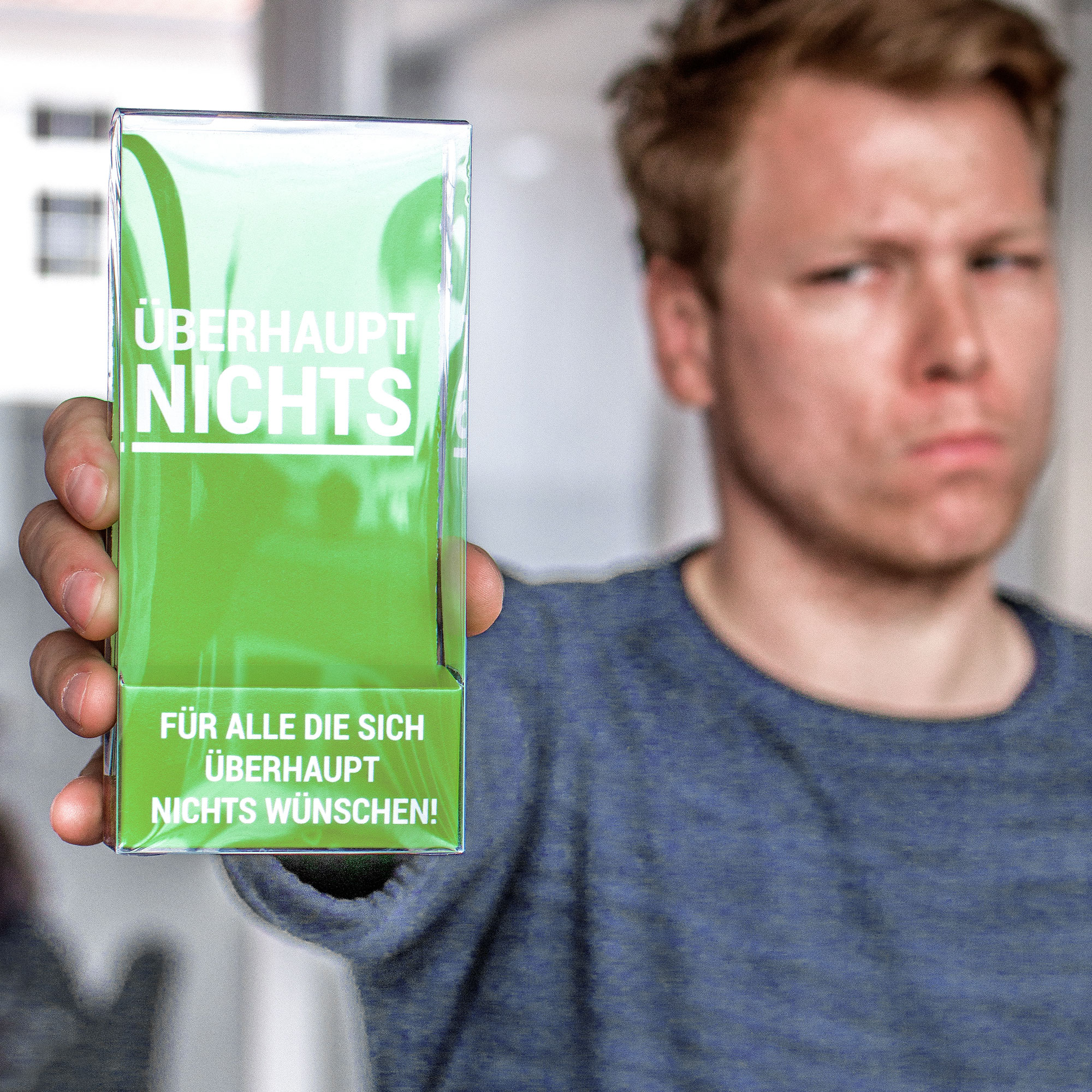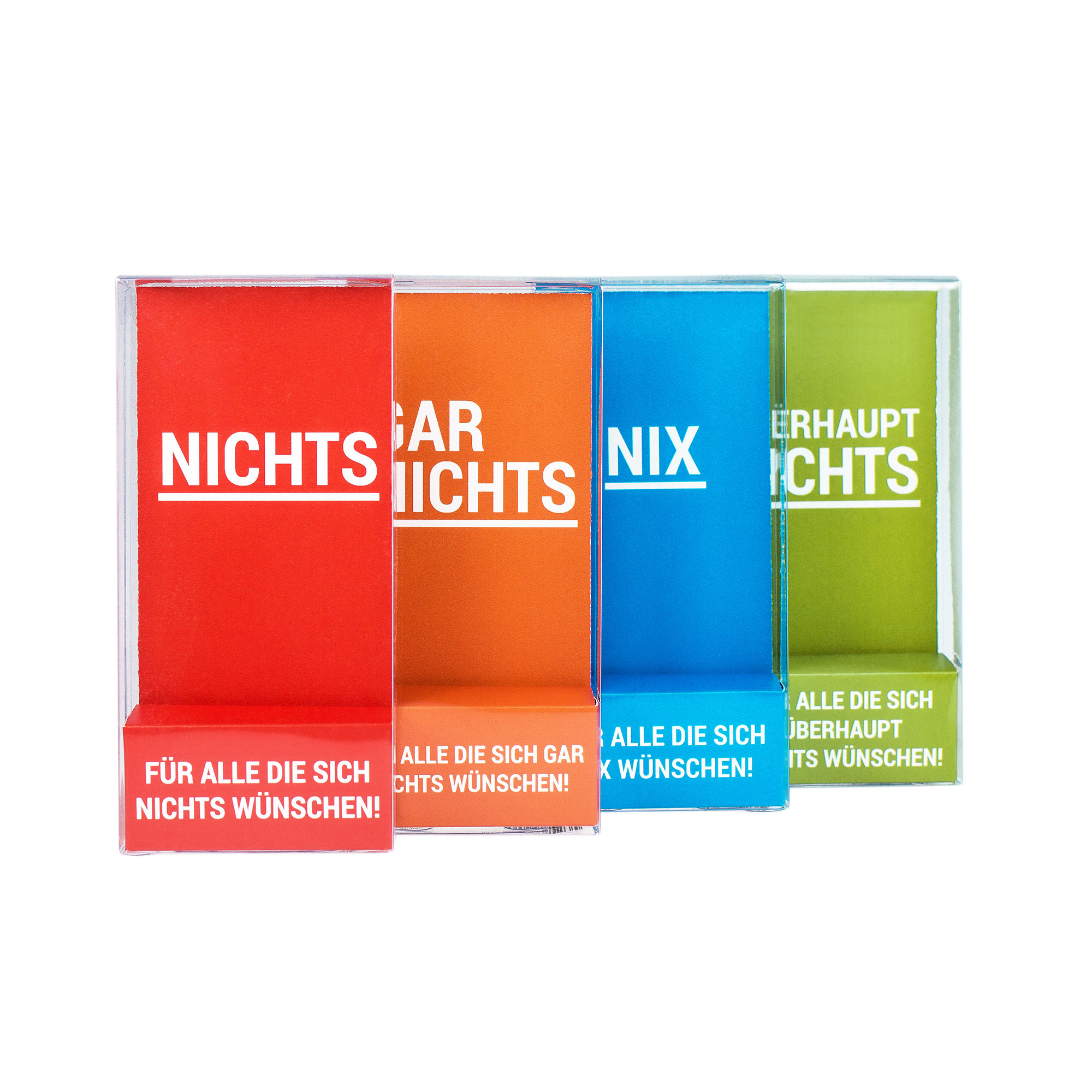 - Der Tipp am Rande: Wenn Du jemanden wirklich zum Nachdenken bringen willst, schenk ihm Nichts – aber in vierfacher Ausführung. Ideal auch als Notfall-Geschenk für spontane Anlässe oder als Running Gag bei Familienfeiern!