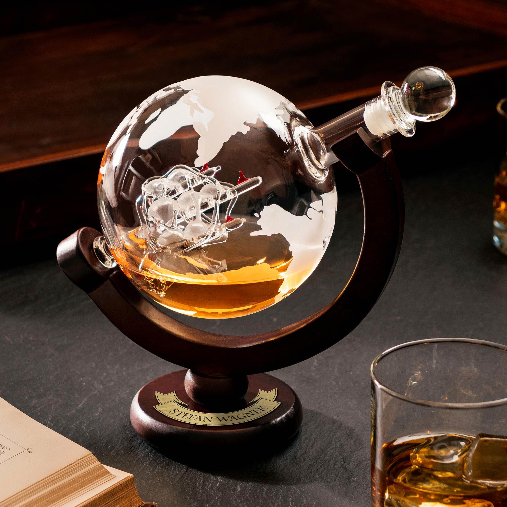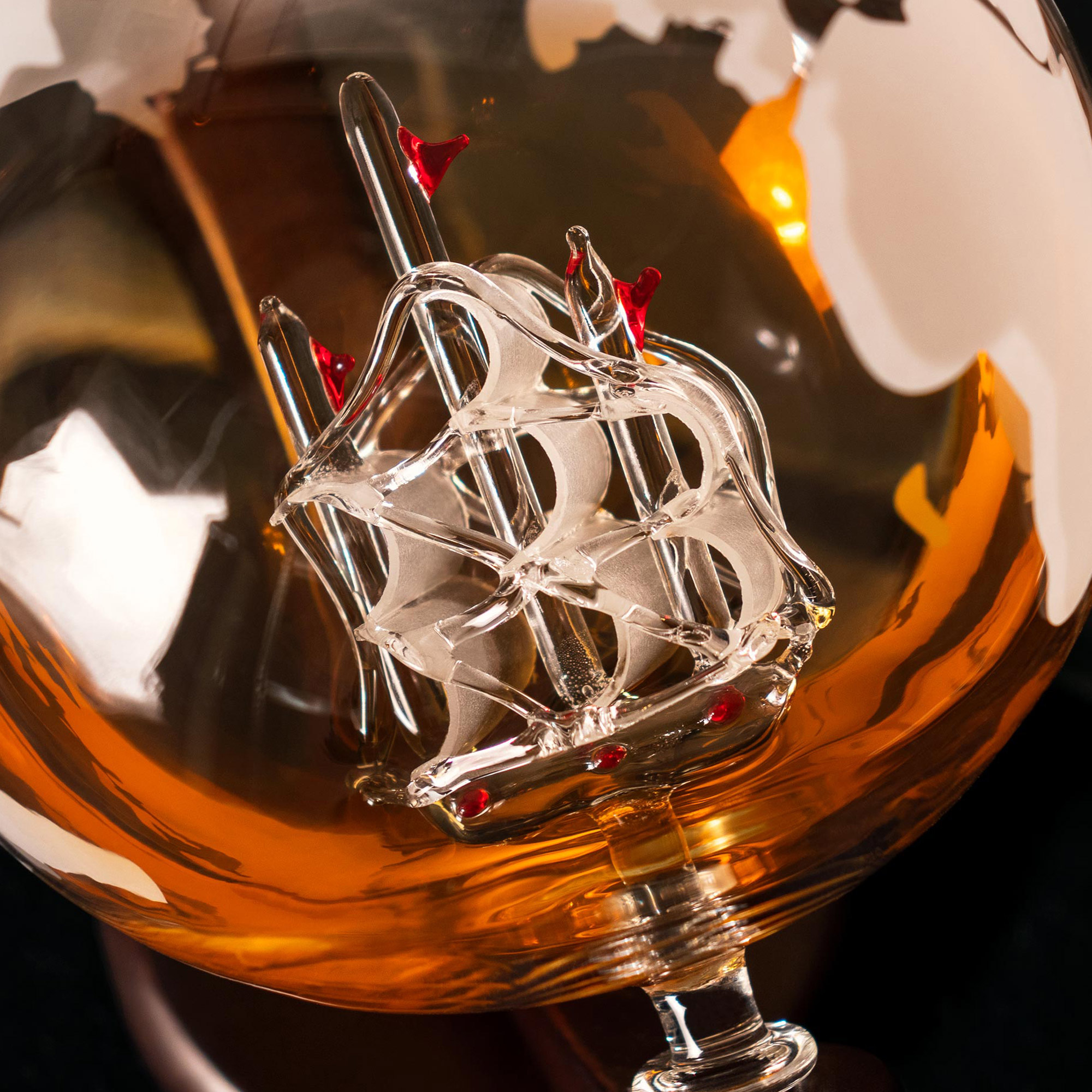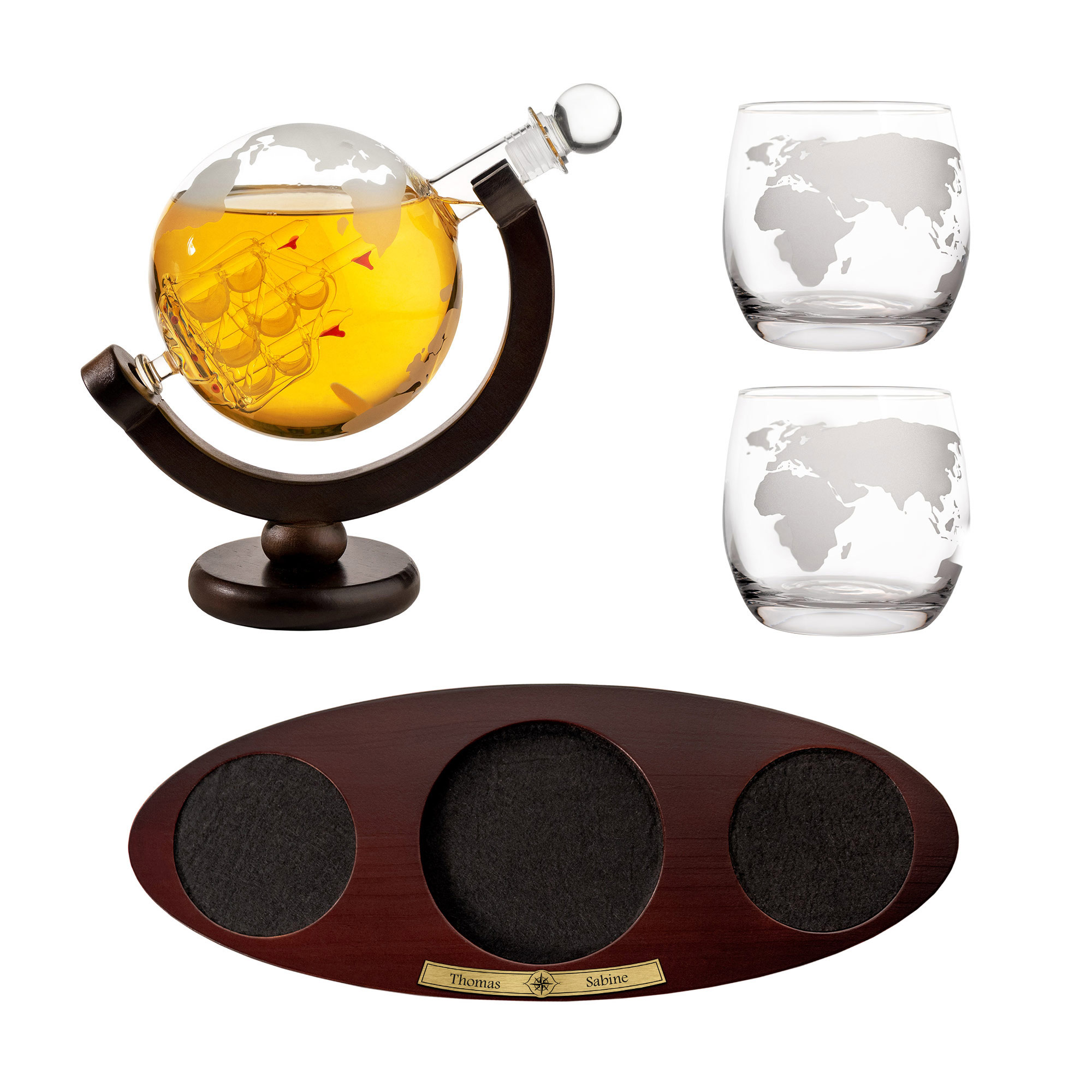 In 80 Genüssen um die Welt - das Whiskyset mit Design Whiskykaraffe inklusive Whiskygläsern und Tablett ist das perfekte Glas Dekanter Set, um die weiten Meere des Whiskygenusses zu durchpflügen. Das Set enthält eine Karaffe in Globusform, in der sich ein Flaschenschiff befindet, zwei Whiskygläser mit Gravur einer Weltkarte sowie ein perfekt auf das Set angepasstes Tablett, auf dem alles dekokrativ aufgestellt werden kann.