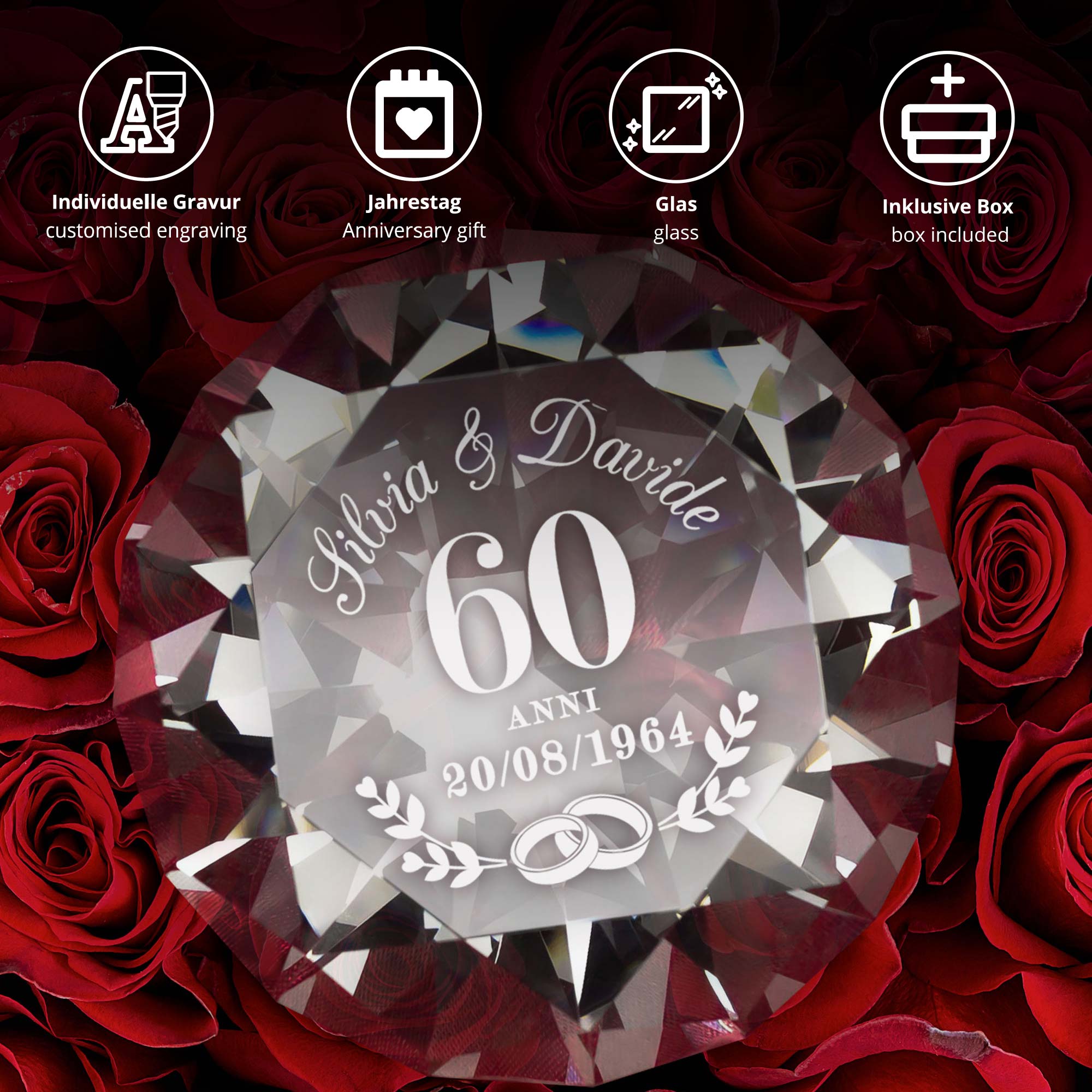60 Jahre Ehe sind ein außergewöhnliches Jubiläum. Die Diamanthochzeit steht für Beständigkeit, Stärke und eine Liebe, die ein ganzes Leben getragen hat. Genau diese Bedeutung spiegelt der personalisierte Diamantkristall wider. Der funkelnde Kristall wird individuell graviert und auf einem eleganten silberfarbenen Ringhalter präsentiert.