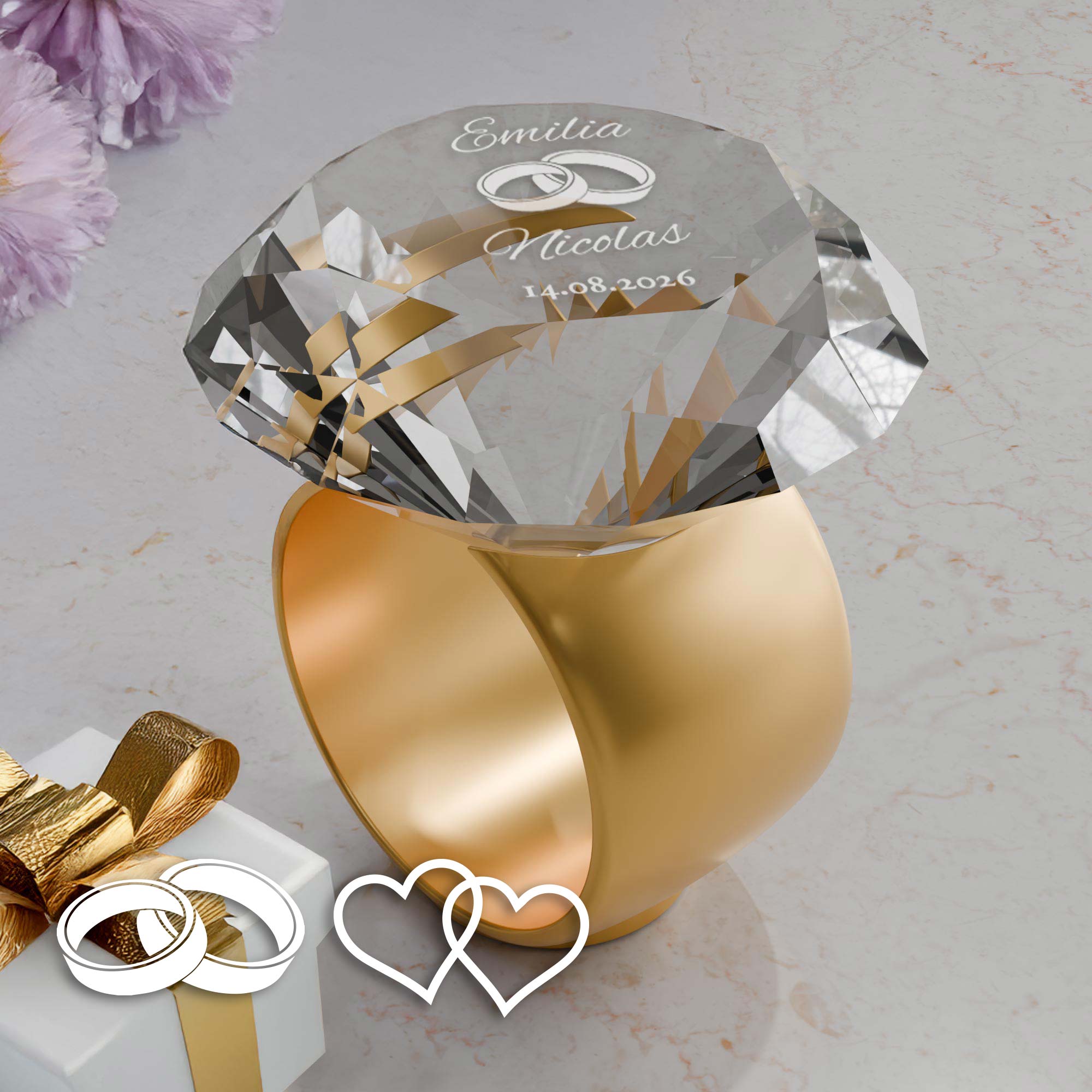 Du suchst ein Geschenk zur Hochzeit, das Eleganz, Emotion und persönliche Note perfekt vereint? Dieses edle Set aus funkelndem Diamantkristall und einem dekorativen Ringhalter wird ganz individuell mit Namen und Hochzeitsdatum graviert – und ist damit ein absolutes Unikat! Wähle zwischen zwei liebevoll gestalteten Gravur-Motiven: ineinander verschlungene Ringe oder romantische Herzen – ganz nach Geschmack.