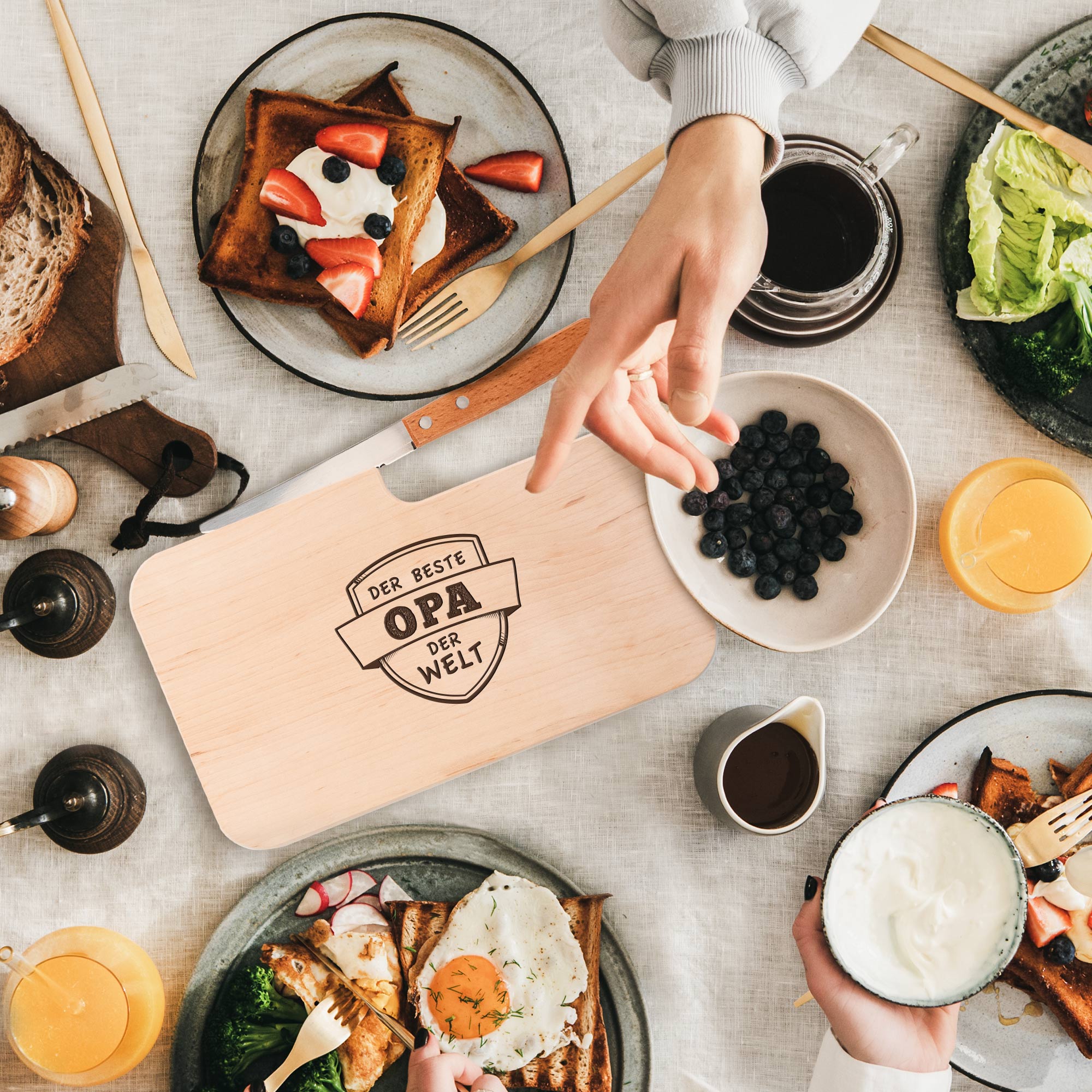 Bringe mit dem Schneidebrett mit Messer einen praktischen Mehrwert in den Alltag Deines Großvaters. Die multifunktionale Kombination aus Holz-Brettchen und Schneidemesser überzeugt auf ganzer Linie und sorgt für mehr Ordnung beim Kochen.