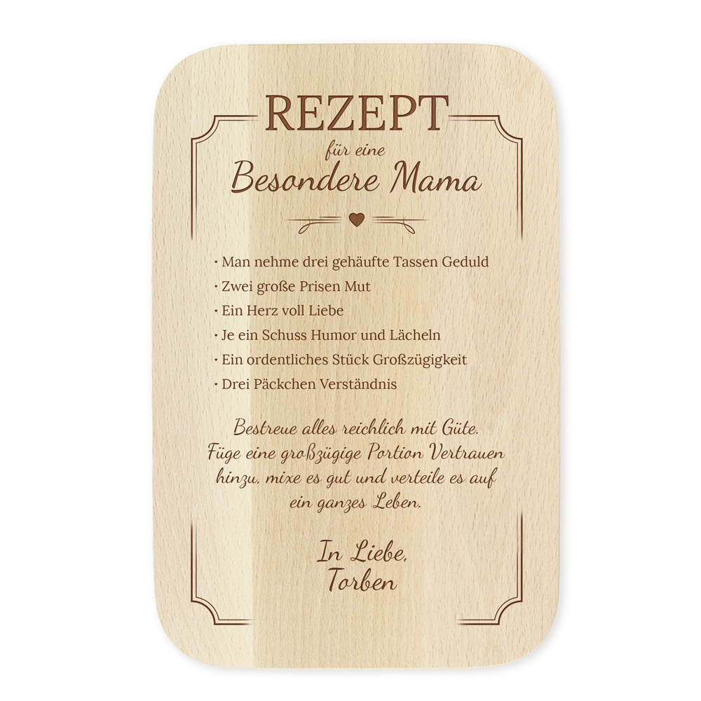 Das Frühstücksbrett mit Gravur - Rezept Mama - Personalisiert ist perfekt, um deiner Mutter den Start in den Tag zu verschönern: Die "Zutaten", die eine besondere Mama auszeichnen, werden in Form eines Rezepts aufgelistet, zum Beispiel "Man nehme drei gehäufte Tassen Mut", "Zwei große Prisen Geduld" oder "Ein Herz voll Liebe". Eingerahmt sind die schönen Rezept - Komplimente von schönen Ornamenten, inklusive kleiner Herzchen. Das zaubert jeder Mama ein Lächeln ins Gesicht und erleichtert einen guten Start in den Tag.