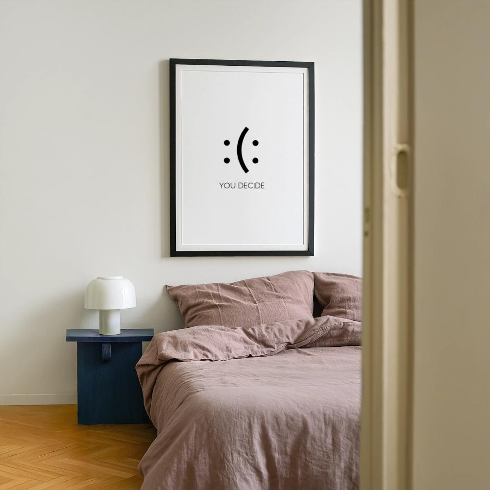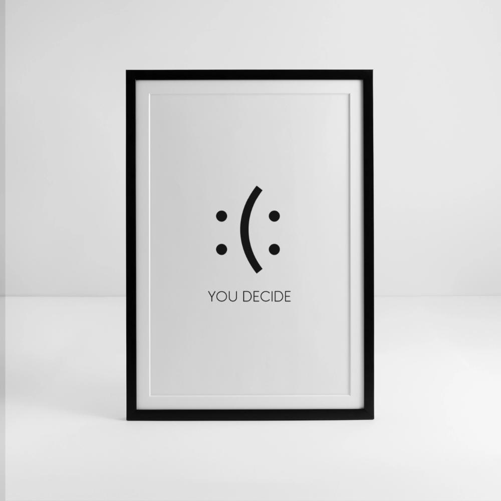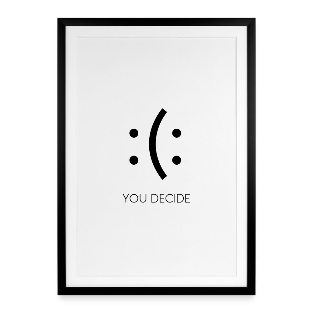Traurig oder glücklich? Dieses gerahmte Poster mit dem cleveren Doppelsmiley und dem Schriftzug „YOU DECIDE“ erinnert jeden Tag daran, wie viel Macht die eigene Haltung hat. Ein starkes, minimalistisches Design, das ohne viele Worte motiviert und zum Umdenken anregt.