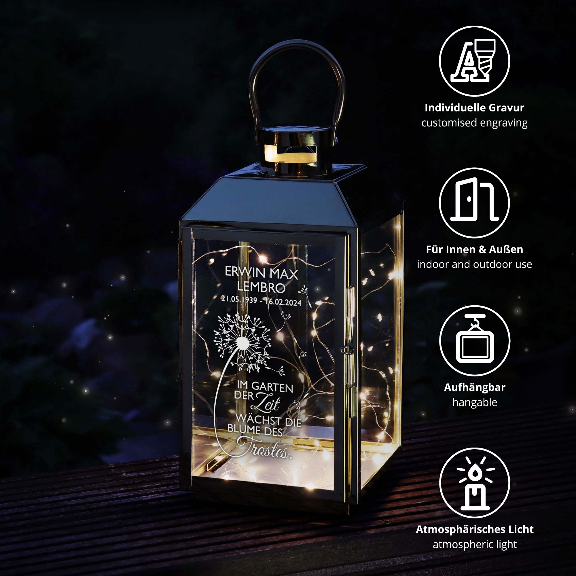 Die Konstruktion schützt das Licht zuverlässig durch Glasscheiben. Die wetterresistente äußere Beschichtung bewahrt sie vor Witterungseinflüssen. Ausgestattet mit einem Henkel, lässt sich die Laterne flexibel platzieren – ob am Grab, im Garten oder in einer Gedenkecke im Innenbereich.