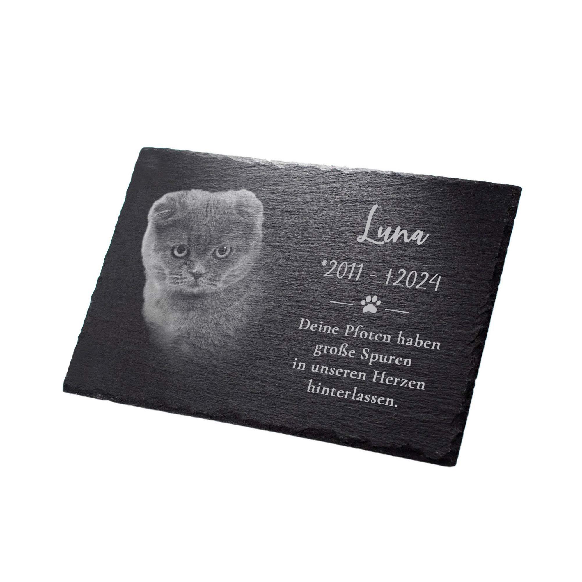 Wenn treue Gefährten von uns gehen, bleibt eine Lücke – und doch auch so viel Liebe. Diese stilvolle Grabplatte aus natürlichem Schiefer ist eine würdevolle Erinnerung an Ihren geliebten Hund oder Ihre geliebte Katze. Sie wird mit Namen, Lebensdaten und einem einfühlsamen Gedenkspruch graviert: "Deine Pfoten haben große Spuren in unseren Herzen hinterlassen".