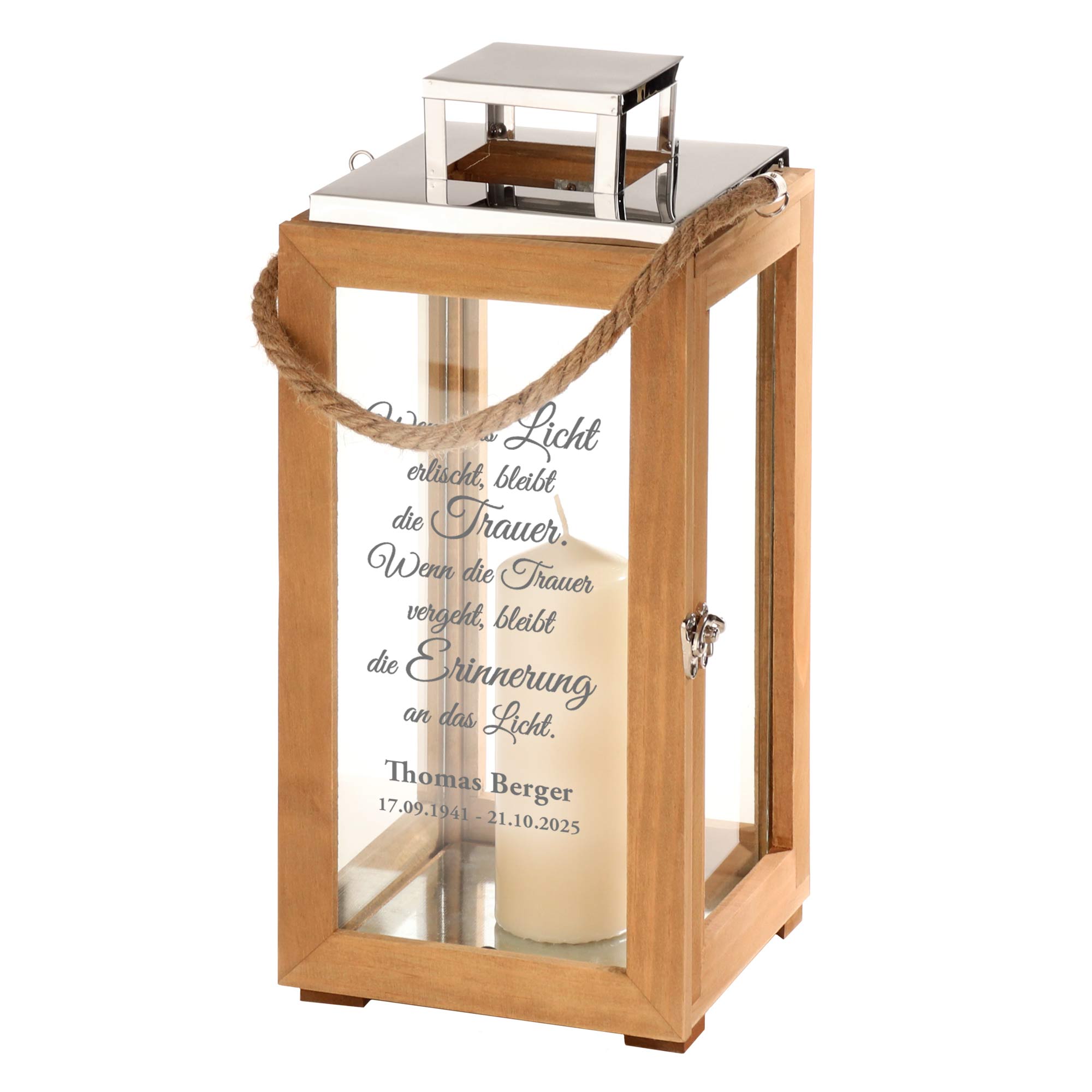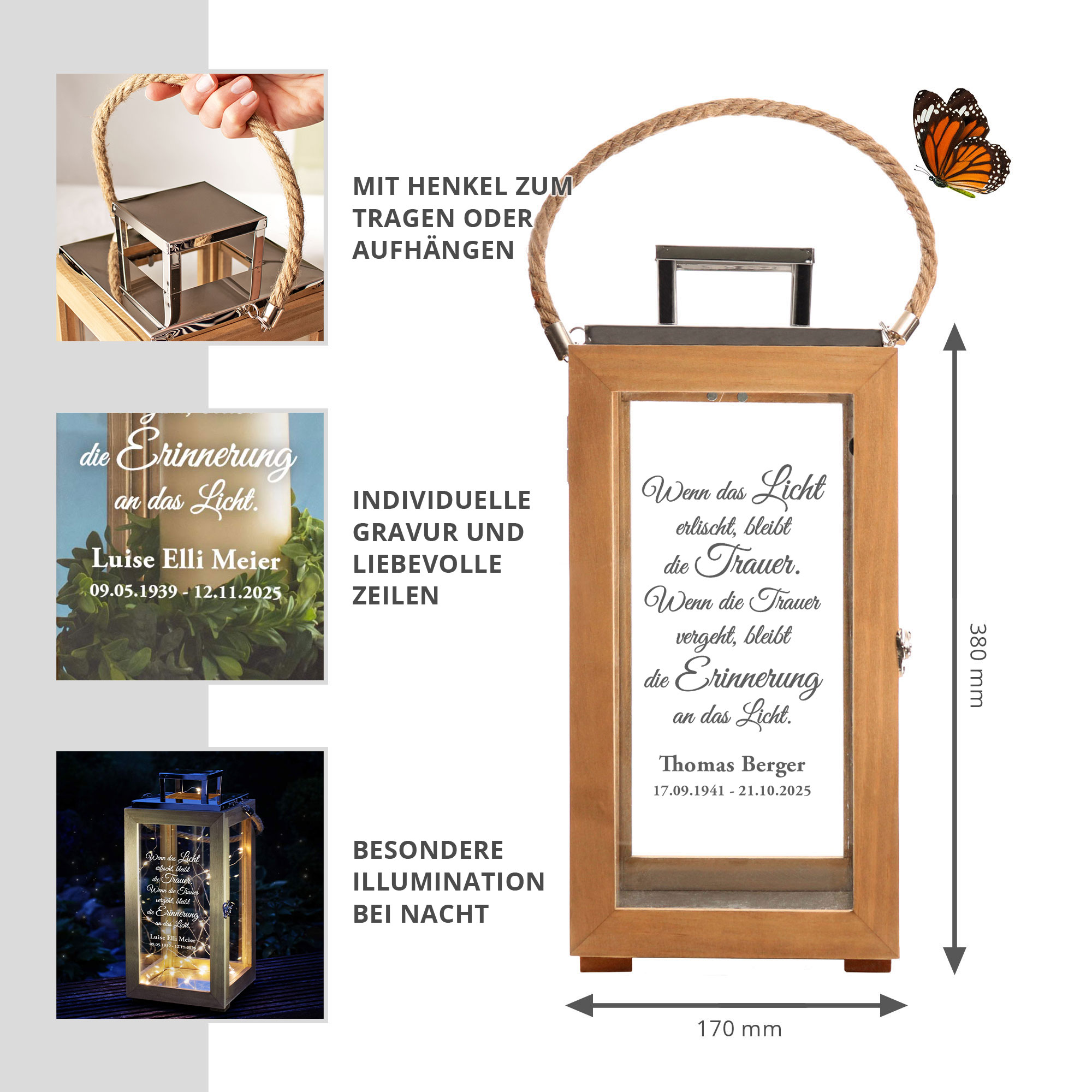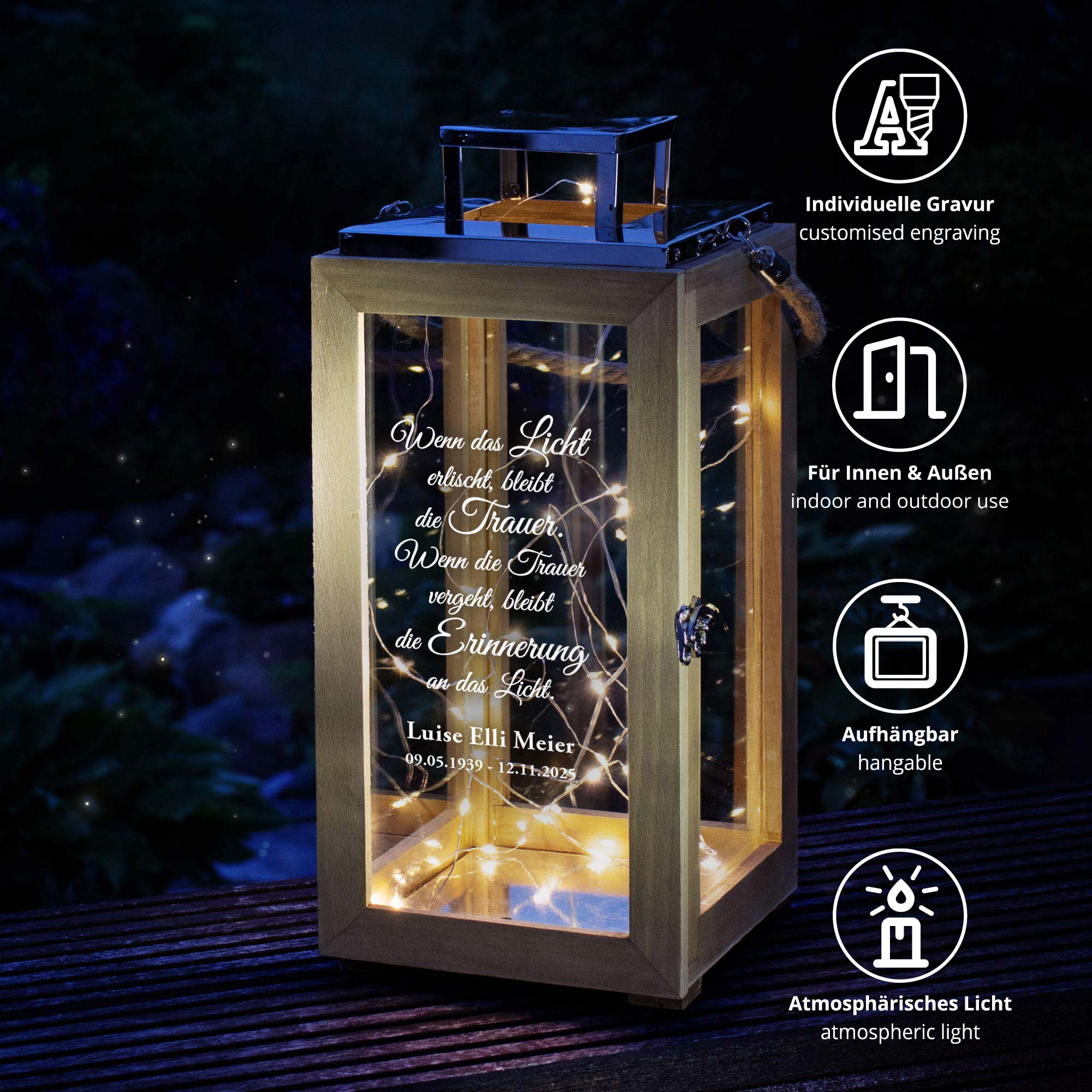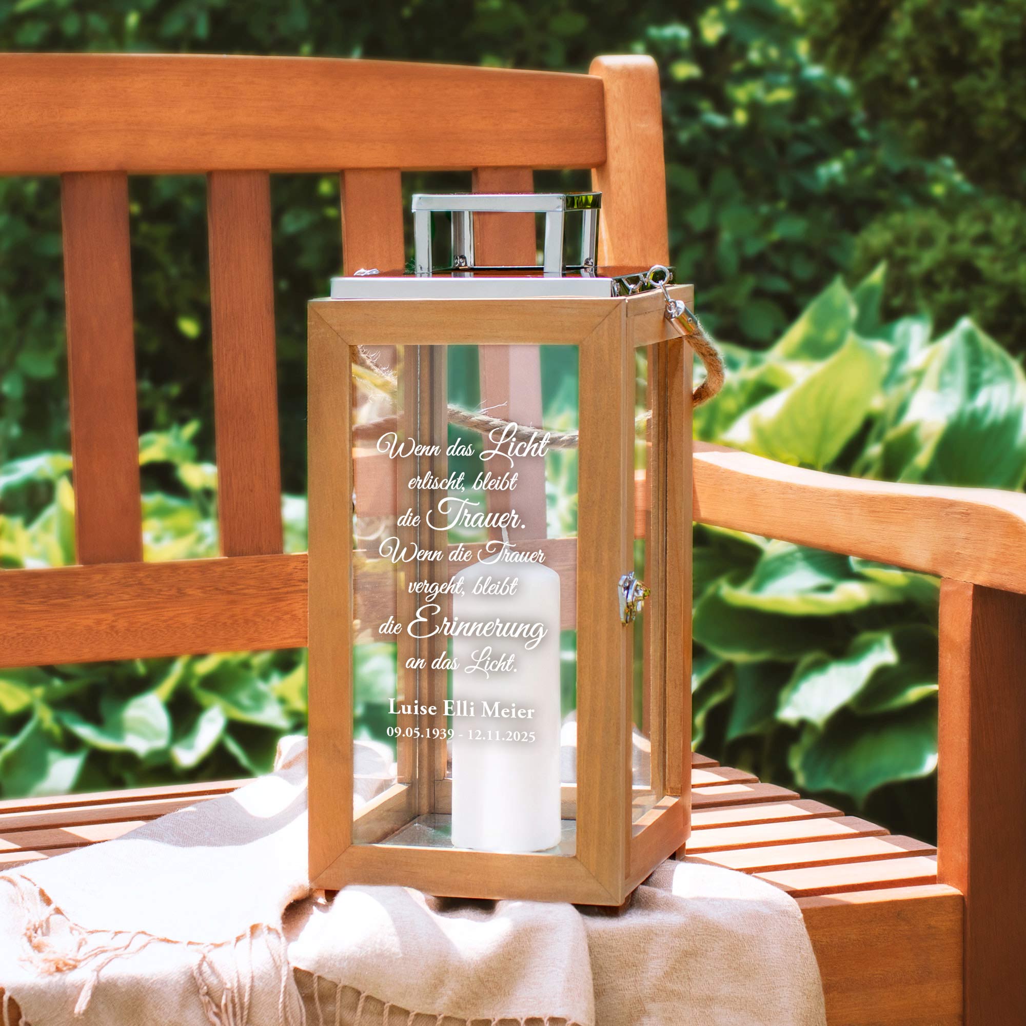 Diese Laterne aus Naturholz kombiniert rustikale Ästhetik mit tiefem Symbolwert. Die Gravur des Spruchs "Wenn das Licht erlischt, bleibt die Trauer. Wenn die Trauer vergeht, bleibt die Erinnerung an das Licht" macht sie zu einem besonderen Erinnerungsstück. Ideal für Gärten, Friedhof oder stille Gedenkecken im Außenbereich.