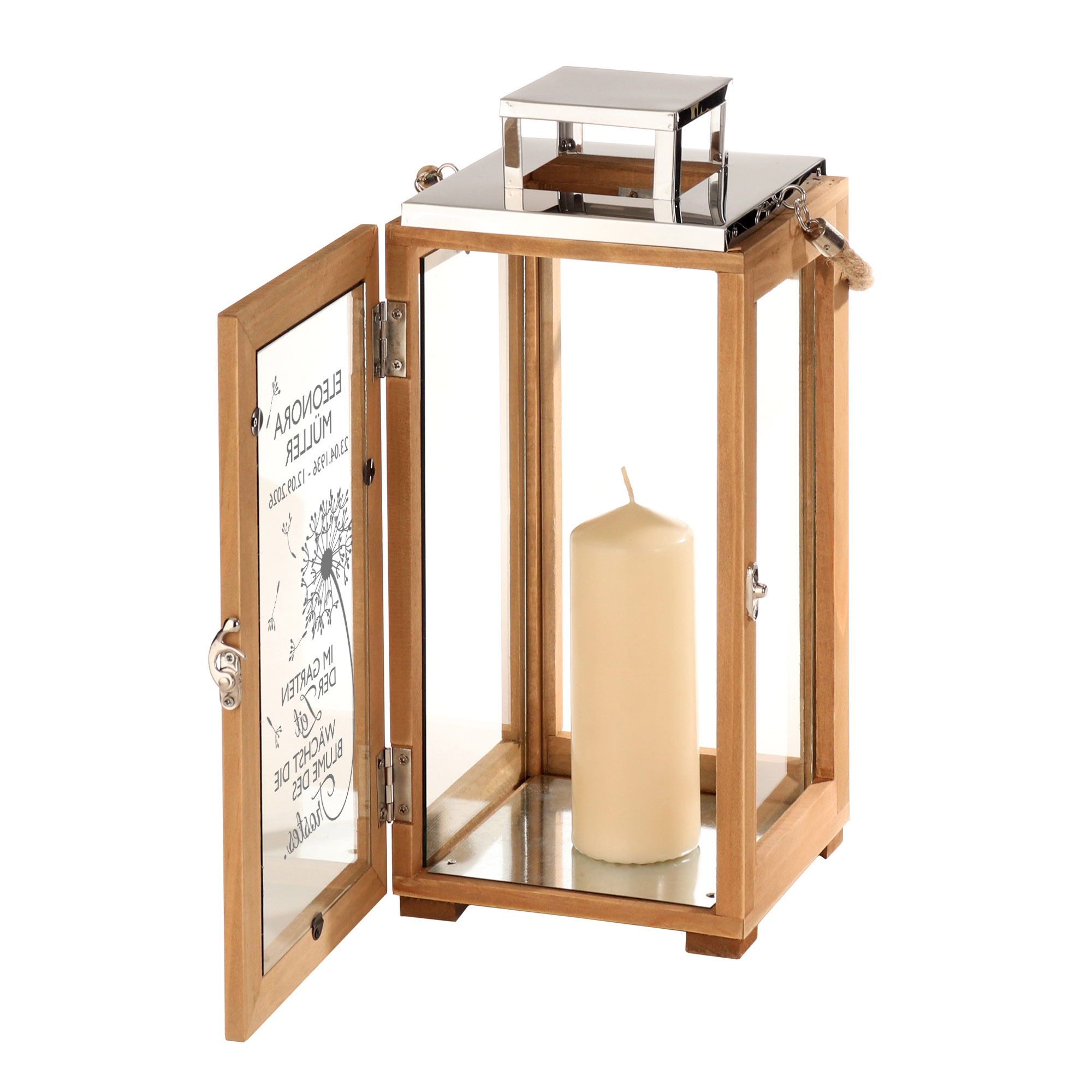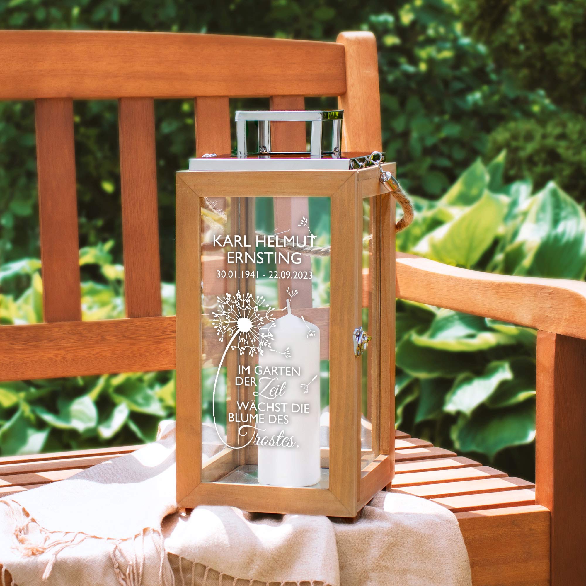 Diese hochwertige Grablaterne mit individueller Gravur ist ein stilles, warmes Licht für die Erinnerung. Auf der Glasfläche befindet sich ein fein graviertes Pusteblumenmotiv sowie der tröstliche Spruch "Im Garten der Zeit wächst die Blume des Trostes". Die Gravur wird durch Namen und Lebensdaten ergänzt und verleiht der Trauerlaterne eine ganz persönliche Note.