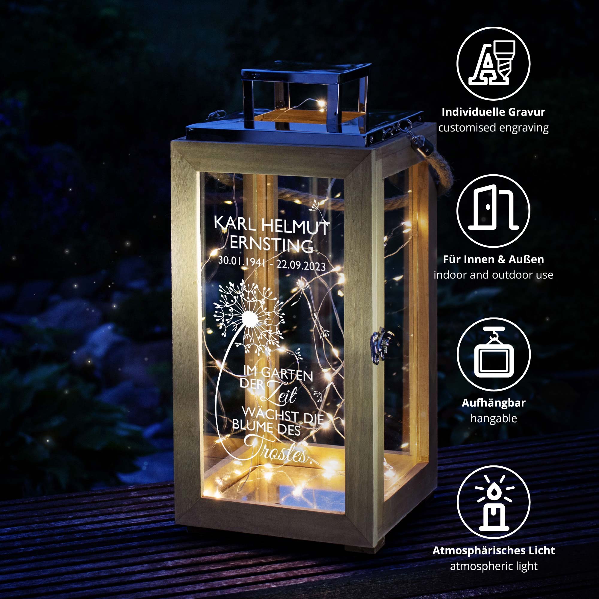 Mit Kordelgriff und natürlicher Holzoptik fügt sich die Laterne harmonisch in Gärten, Balkone oder Innenräume ein. Ein gefühlvolles Andenken für stille Stunden des Gedenkens – oder als liebevolles Geschenk zur Anteilnahme bei Trauerfällen.