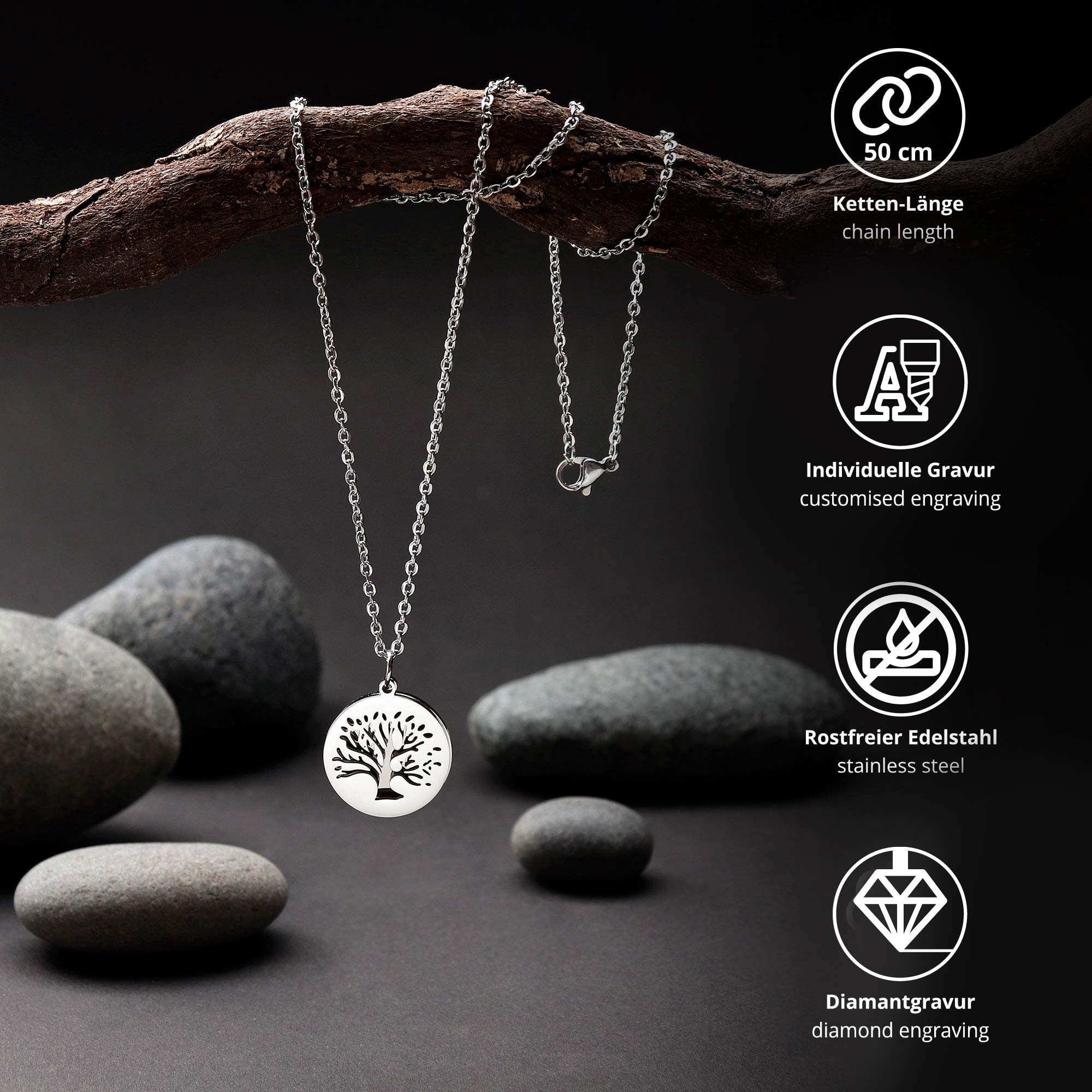 Diese silberne Lebensbaum‑Kette vereint Symbolkraft und Individualität in einem feinen Schmuckstück. Der Lebensbaum steht für Wurzeln, Wandel und Erinnerung – ein kraftvolles Symbol des Gedenkens. Der zweite Anhänger lässt sich mit bis zu zwei Zeilen gravieren (die zweite optional) und ermöglicht so eine persönliche Widmung oder ein Datum.
