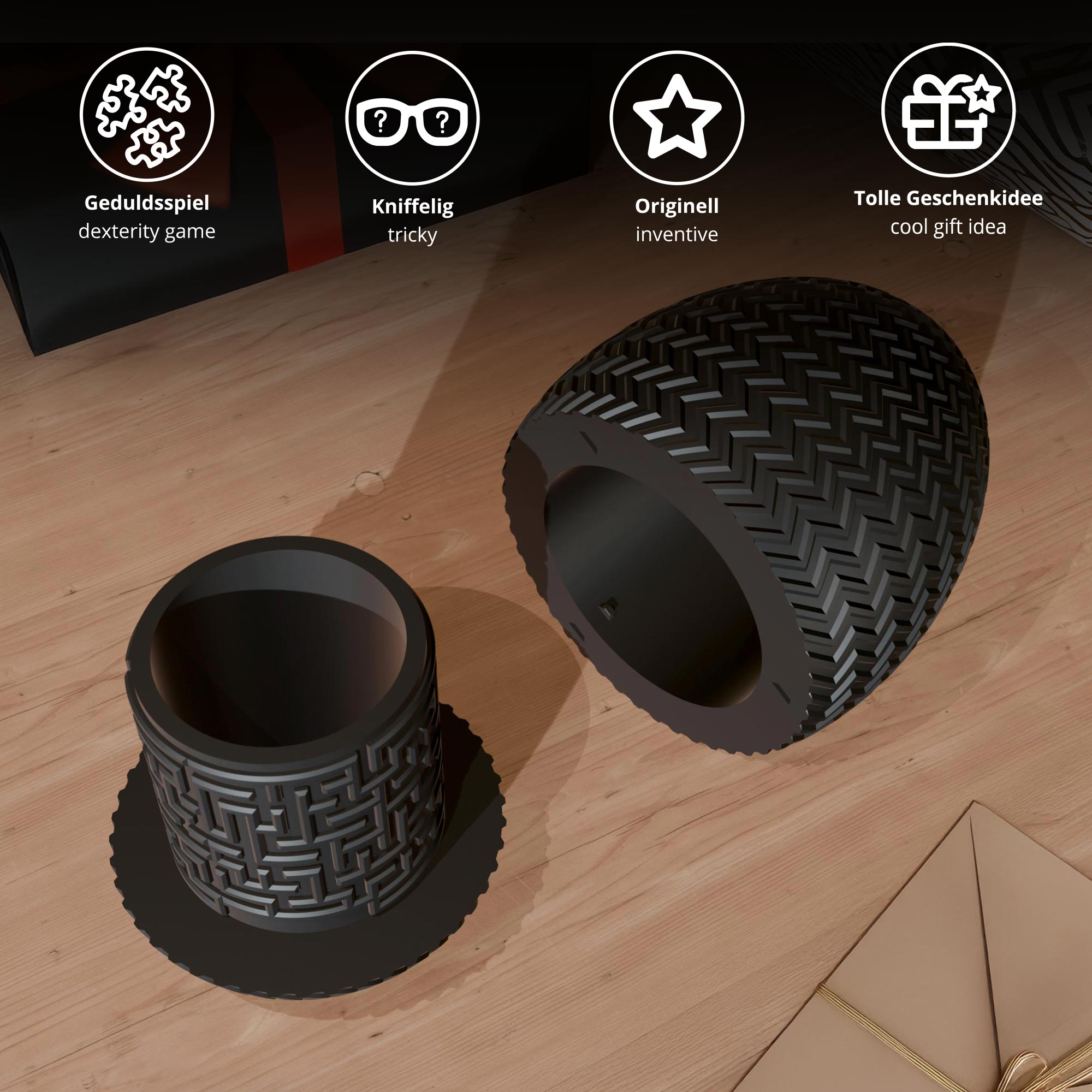Die Labyrinthbox Ei in Schwarz ist weit mehr als eine einfache Geschenkverpackung. Sie macht aus kleinen Aufmerksamkeiten ein interaktives Erlebnis und sorgt schon vor dem eigentlichen Auspacken für Spannung. Denn der Inhalt bleibt zunächst verborgen: Erst wer das integrierte Labyrinth meistert, gelangt an das versteckte Fach im Inneren.