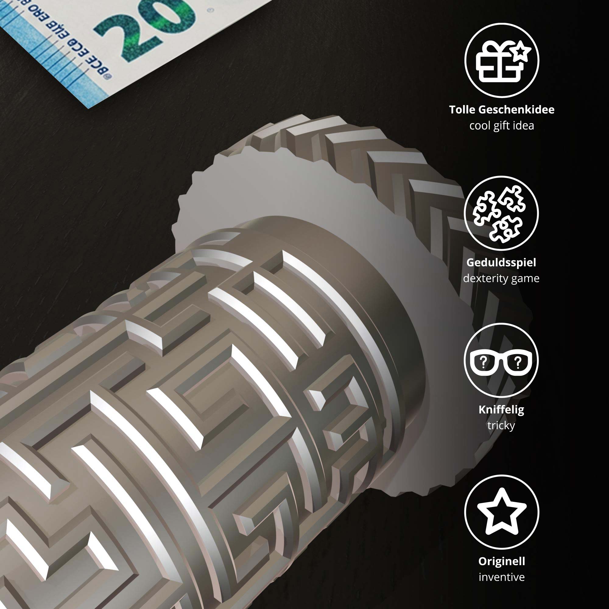 Einfach Geld schenken? Viel zu langweilig! Mit dieser Labyrinthbox wird Dein Geschenk zur echten Challenge. Bevor der Inhalt zum Vorschein kommt, muss erst das integrierte Labyrinth gelöst werden – Geduld und Geschick sind gefragt! Die stylische Röhre in Silber-Optik wurde im 3D-Druck gefertigt und überzeugt mit ihrem modernen Look. Ob Geldschein, Gutschein oder kleine Überraschung – alles wird sicher verstaut und erst nach ein wenig Knobelarbeit freigegeben.