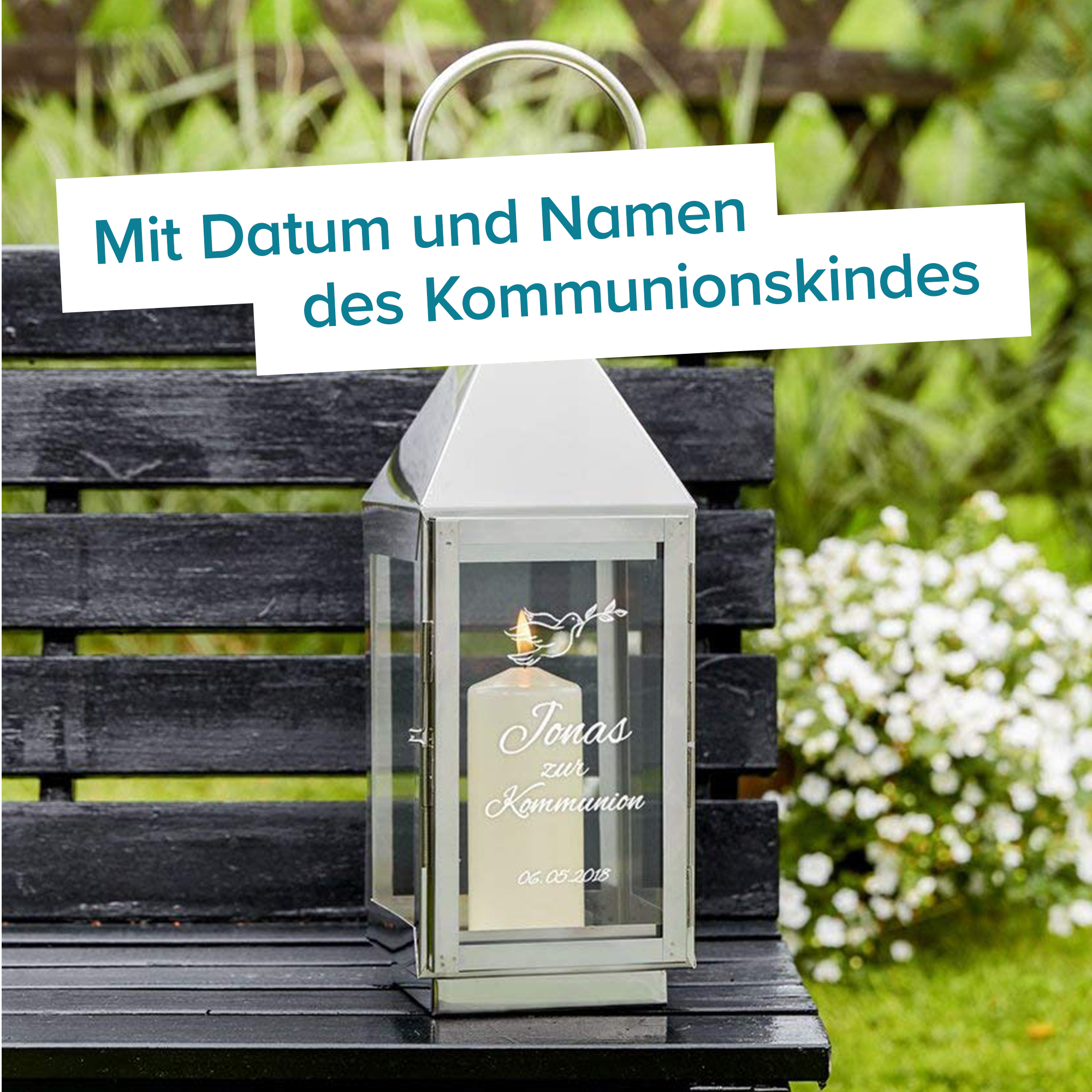 Die Erstkommunion ist ein besonderes Ereignis - und ist ein schönes Fest, um einen Menschen in der Gemeinde willkommen zu heißen. Unsere Laterne zur Kommunion ist ein Kommunionsgeschenk mit einem hohem Symbolwert. Denn eine Laterne bedeutet immer auch, dass in ihr ein Licht brennt, das einem Menschen den Weg weisen kann. Und was, wenn nicht ein Geschenk zur Kommunion, sollte als Wegweiser geeignet sein? Noch dazu wird die Kommunionslaterne individuell graviert, so dass die Laterne ein schicke uns persönliches Geschenk wird, das perfekt als Dekolaterne für den Garten oder das Haus geeignet ist - und symbolisch den weiteren Lebensweg des neuen Gemeindemitglieds beleuchtet.