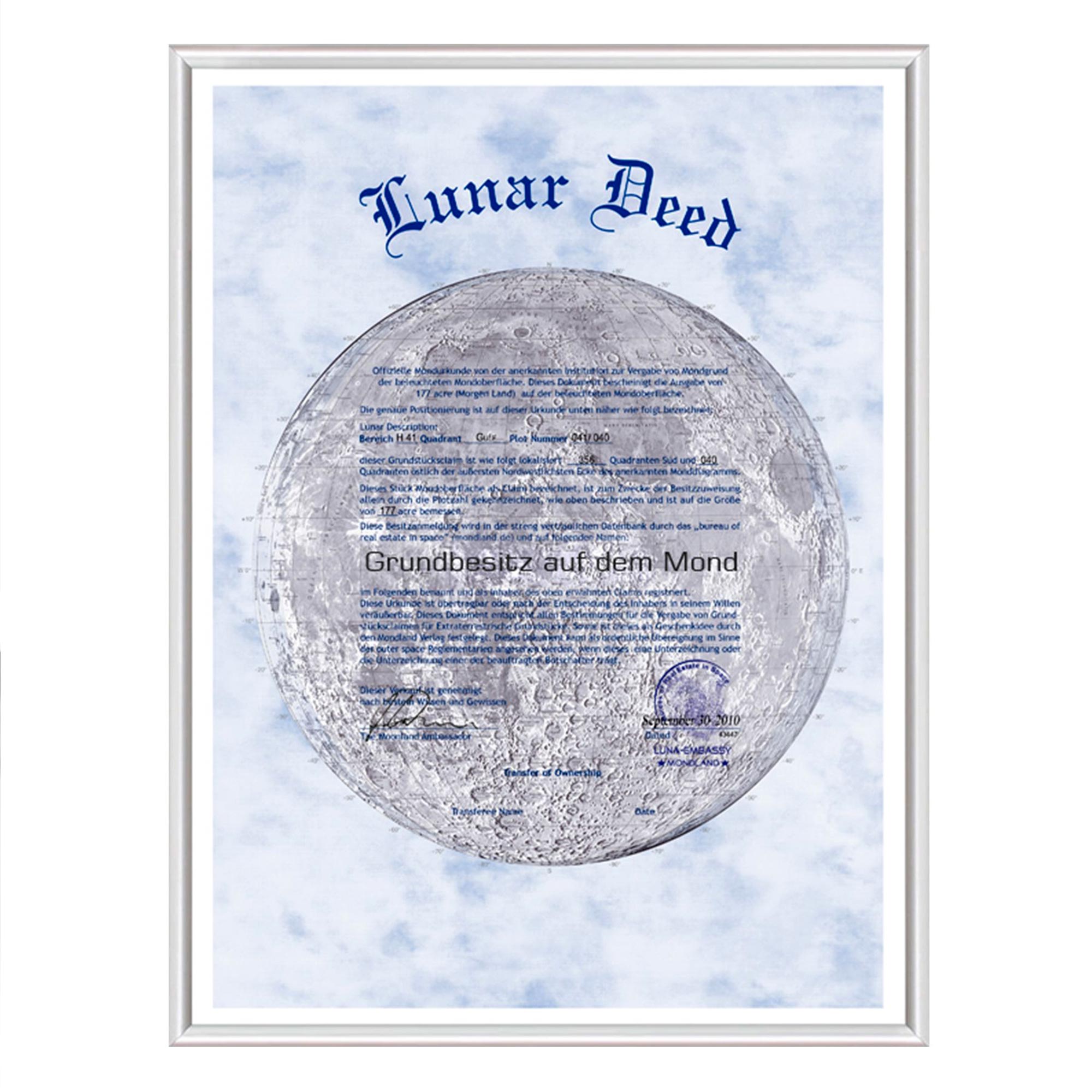 • Der Tipp am Rande: Rahme die Urkunde ein und hänge sie gut sichtbar auf – so wird Dein Mondgrundstück nicht nur zum Gesprächsthema, sondern auch zum stilvollen Blickfang in Deinem Zuhause.
