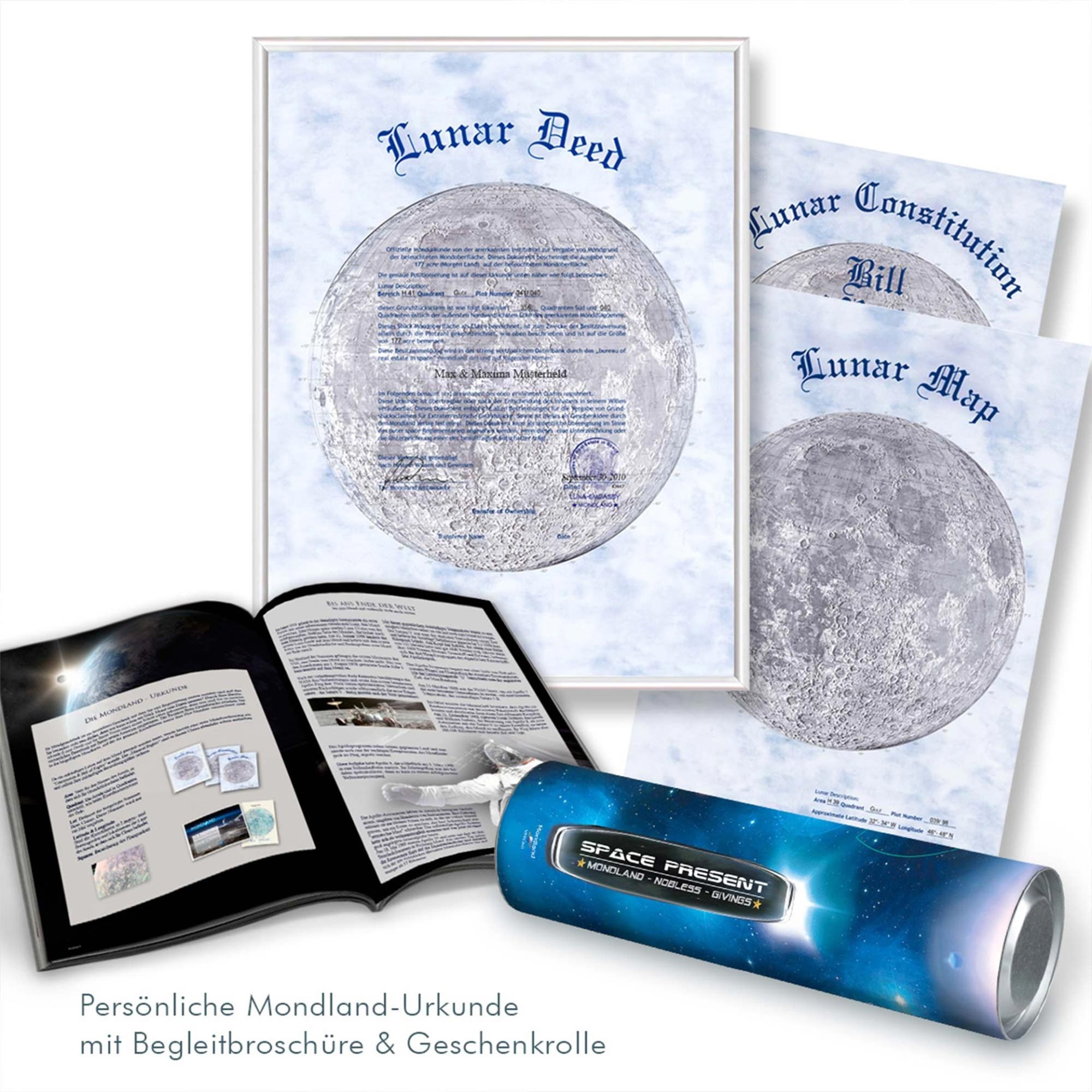 Ein Stück Mond – nur für Dich. Mit diesem außergewöhnlichen Produkt sicherst Du Dir Dein eigenes Grundstück auf der erdzugewandten Seite des Mondes. Die beeindruckende Größe und die exakten Koordinaten machen Dein Mondland zu etwas ganz Besonderem. Das Set enthält hochwertige Urkunden, eine detaillierte Mondkarte und einen Auszug der Mondverfassung. Alles wird individuell auf Deinen Namen ausgestellt und stilvoll präsentiert. Die zusätzliche Anstecknadel "Moonland Owner" macht Deinen Besitz sogar im Alltag sichtbar – ein dezentes Statement mit Augenzwinkern.