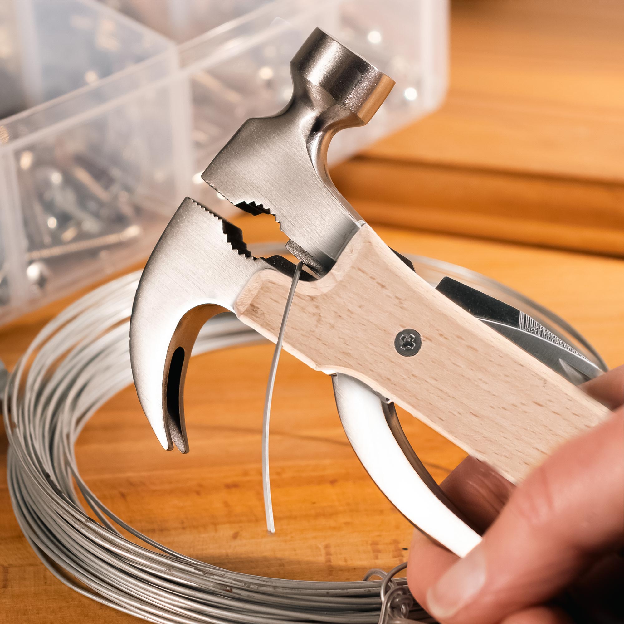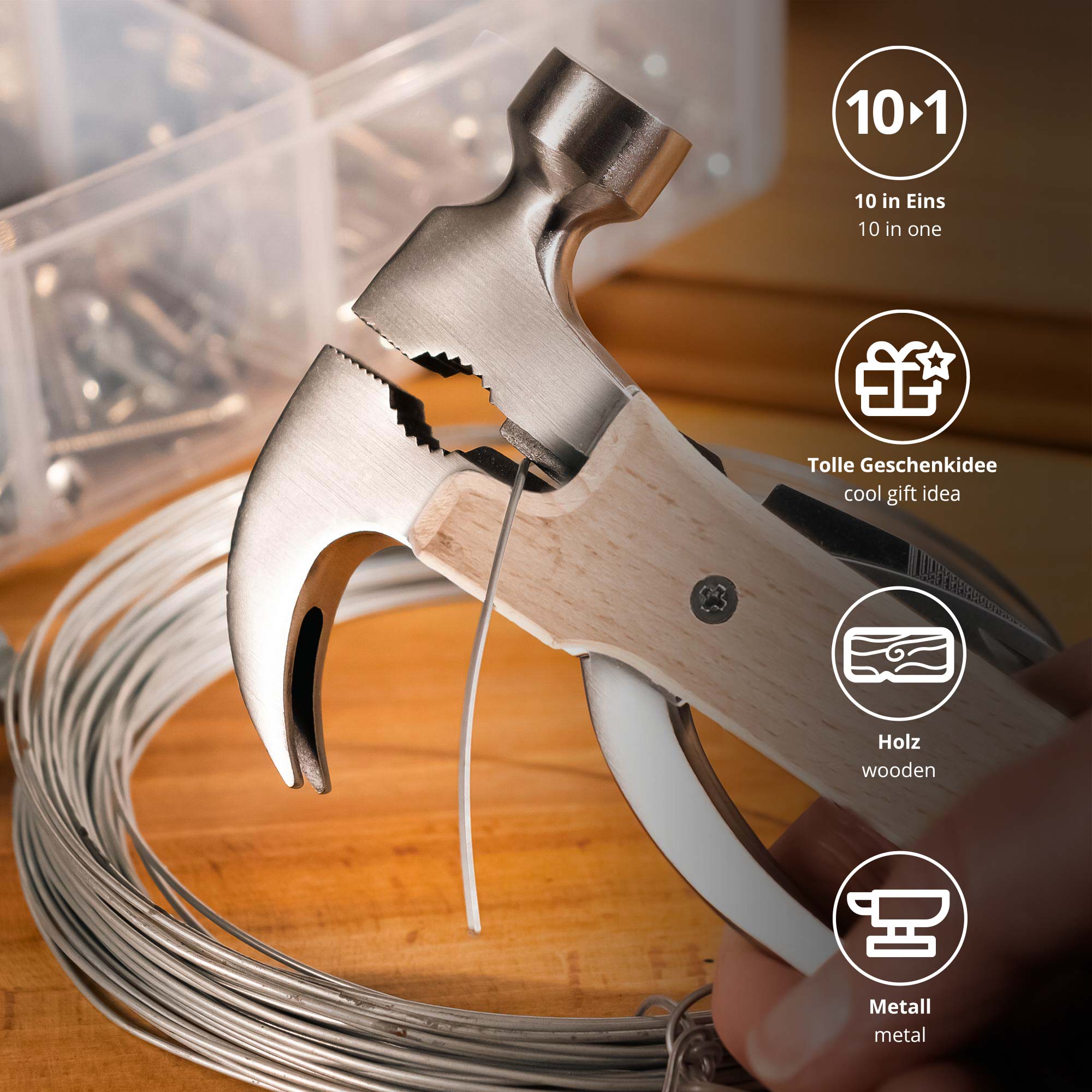 Ein echter Alleskönner für alle, die handwerklich gerne mal selbst Hand anlegen: Das Holz Hammer Multifunktionswerkzeug kombiniert gleich zehn praktische Funktionen in einem kompakten Design. Mit Hammer, Zange, Drahtschneider, Sägeblatt und mehr bist Du auf spontane Reparaturen genauso vorbereitet wie auf größere Outdoor-Einsätze. Besonders edel: Der Griff aus Holz in Kombination mit dem rostfreien Edelstahl – das sieht nicht nur gut aus, sondern liegt auch sicher in der Hand.