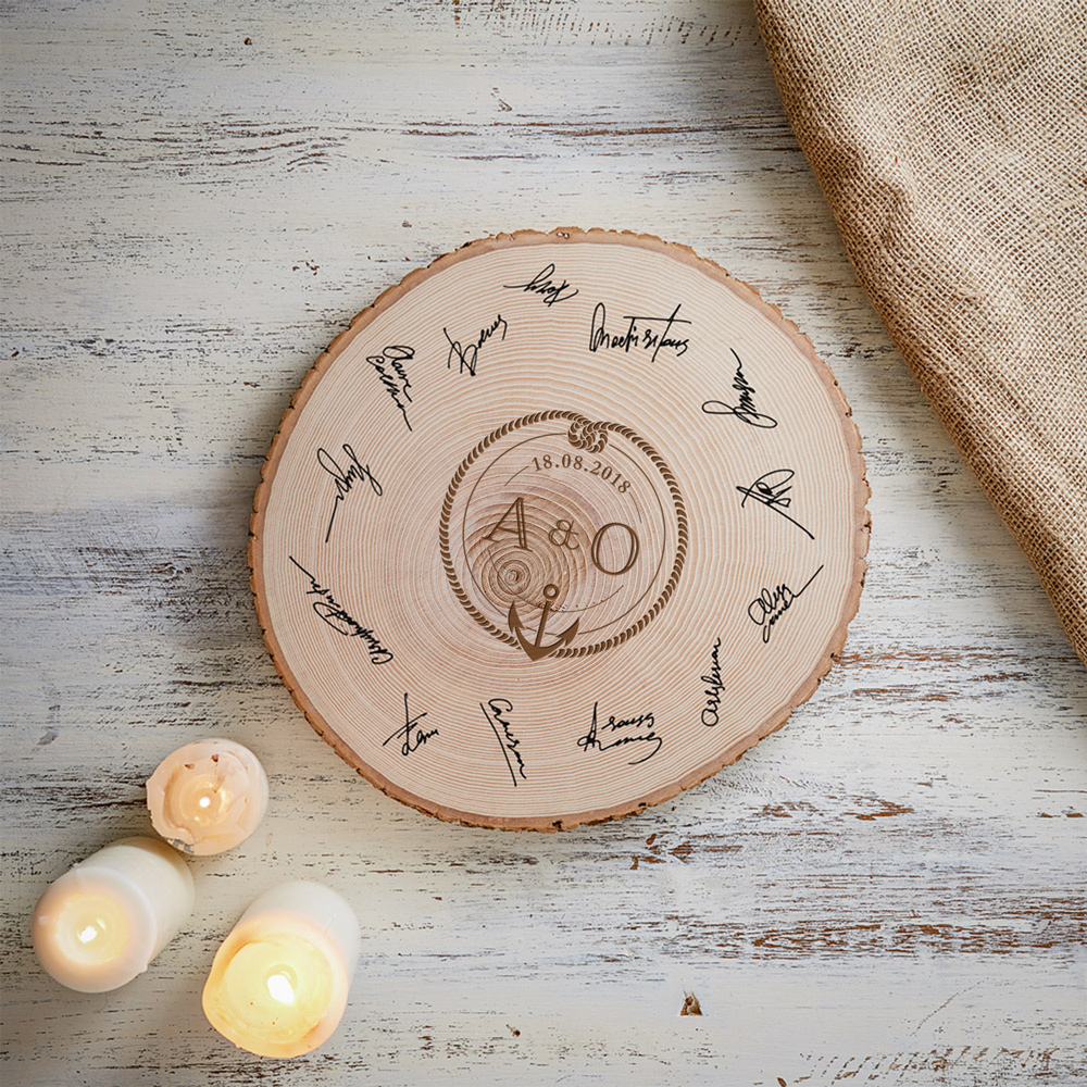 Ein besonderer Tag, der nicht in Vergessenheit geraten soll, muss auf jeden Fall festgehalten werden. Das selbstverständlich mit Fotos und Videos - aber eben auch mit einzigartigeren Erinnerungstücken. Die Riesenbaumscheibe mit Gravur ist ein solches Erinnerungstück, das mit seiner individuellen Gravur auf jeden Fall Freude machen wird - noch dazu ist auf der großen gravierten Baumscheibe genügend Platz für Unterschriften.
