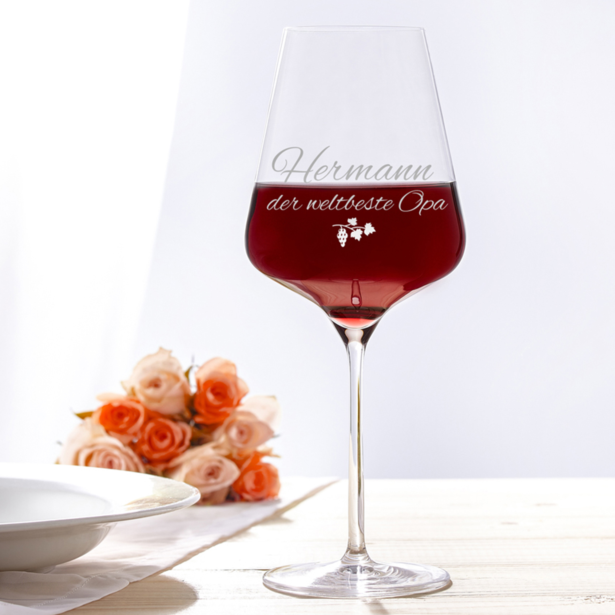 Das Glas ist mit einem von drei schönen Weinmotiven graviert sowie einem Wunschnamen, also ein perfektes persönliches Weinglas graviert nach deinen Wünschen. So kann dein Opa seinen Wein noch besser genießen. Eine tolle Geschenkidee zum Vatertag oder für den Opa zum Geburtstag.