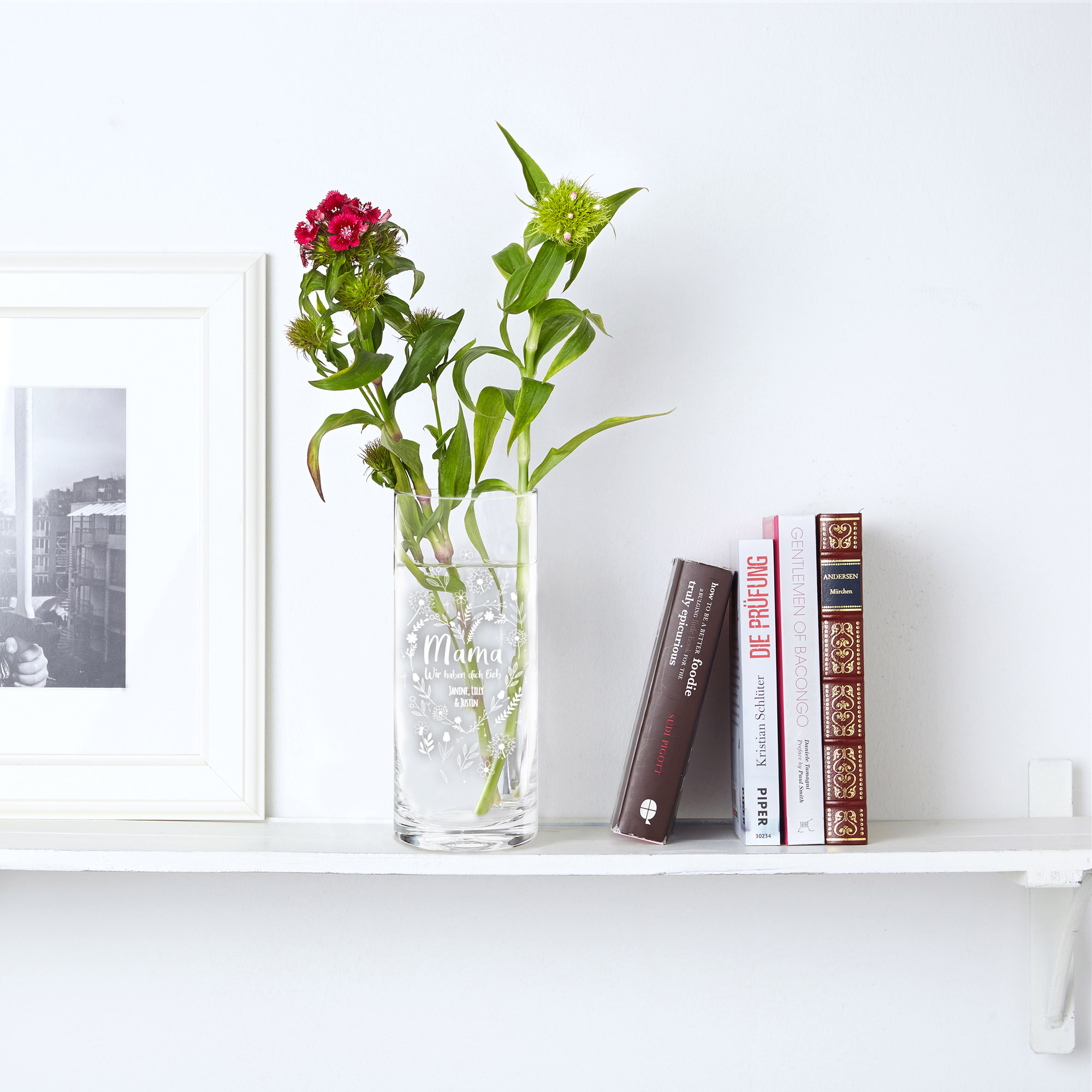 Blumen, so weit das Auge reicht: Die zierliche Glasvase schmückt ein verspieltes Blumenmotiv in Herzform, in das Deine ganz individuelle Gravur eingelassen wird. Sowohl der Name Deiner Mutter als auch Dein Name und gegebenenfalls die Namen Deiner Geschwister werden von uns auf die Vase graviert. Somit ist diese Blumenvase weit mehr als eine bloße Aufbewahrungsmöglichkeit für florale Dekoration. Bei jedem Blick wird Deiner Mutter an die Zuneigung und Liebe erinnert, die hinter diesem Geschenk stecken!