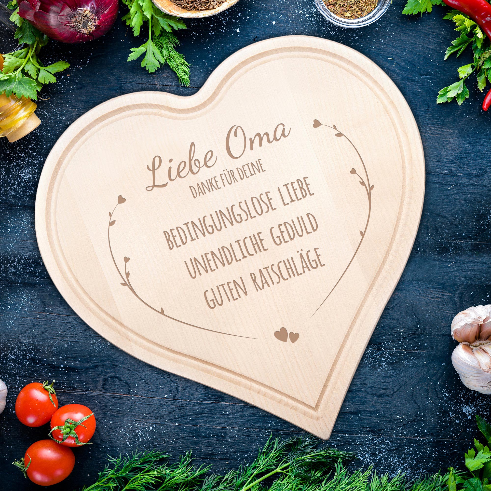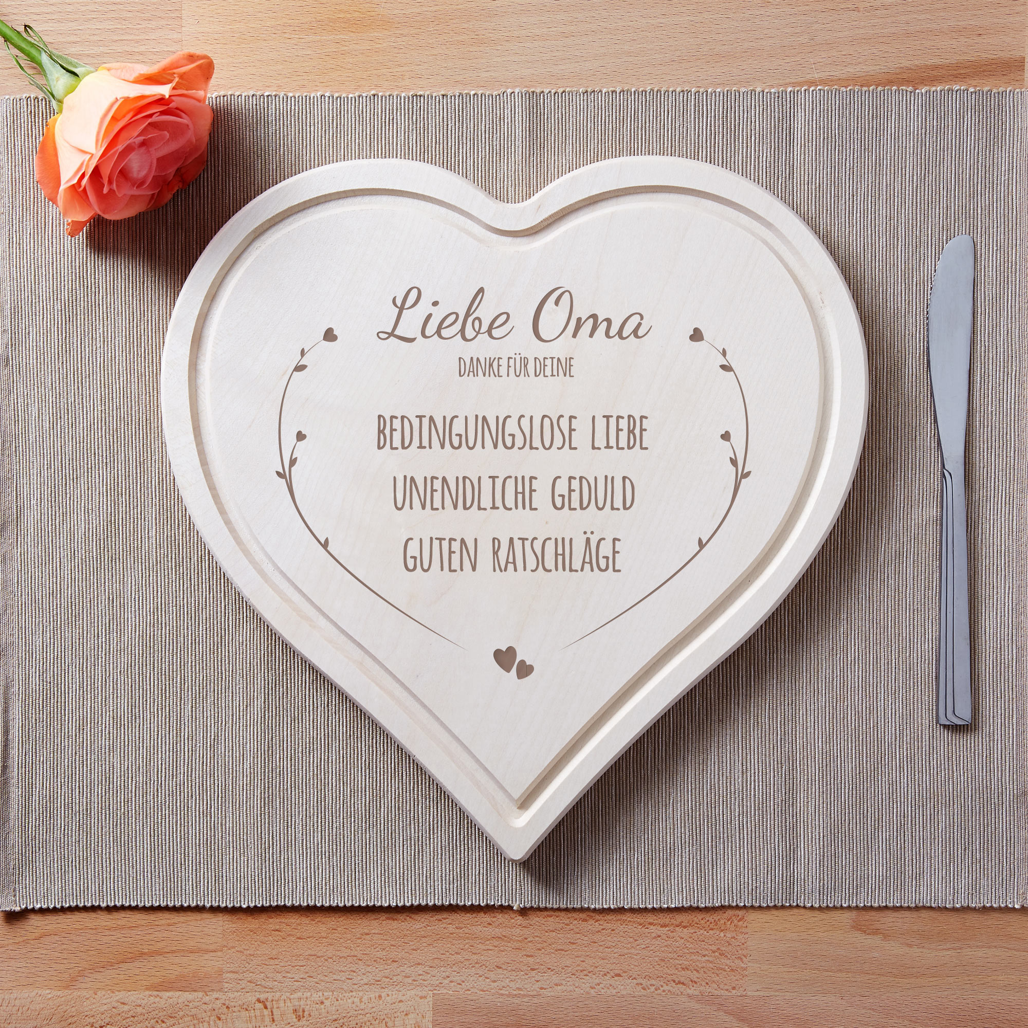 Eine große Freude für die Oma: Das Herzbrett mit Gravur ist ein schönes Schneidebrett für alle Omas, die gerne kochen. Denn das hochwertige Küchenbrett ist perfekt für den täglichen Einsatz in der Küche, aber auch ideal beispielsweise als Servierbrettchen oder Käsebrett geeignet.