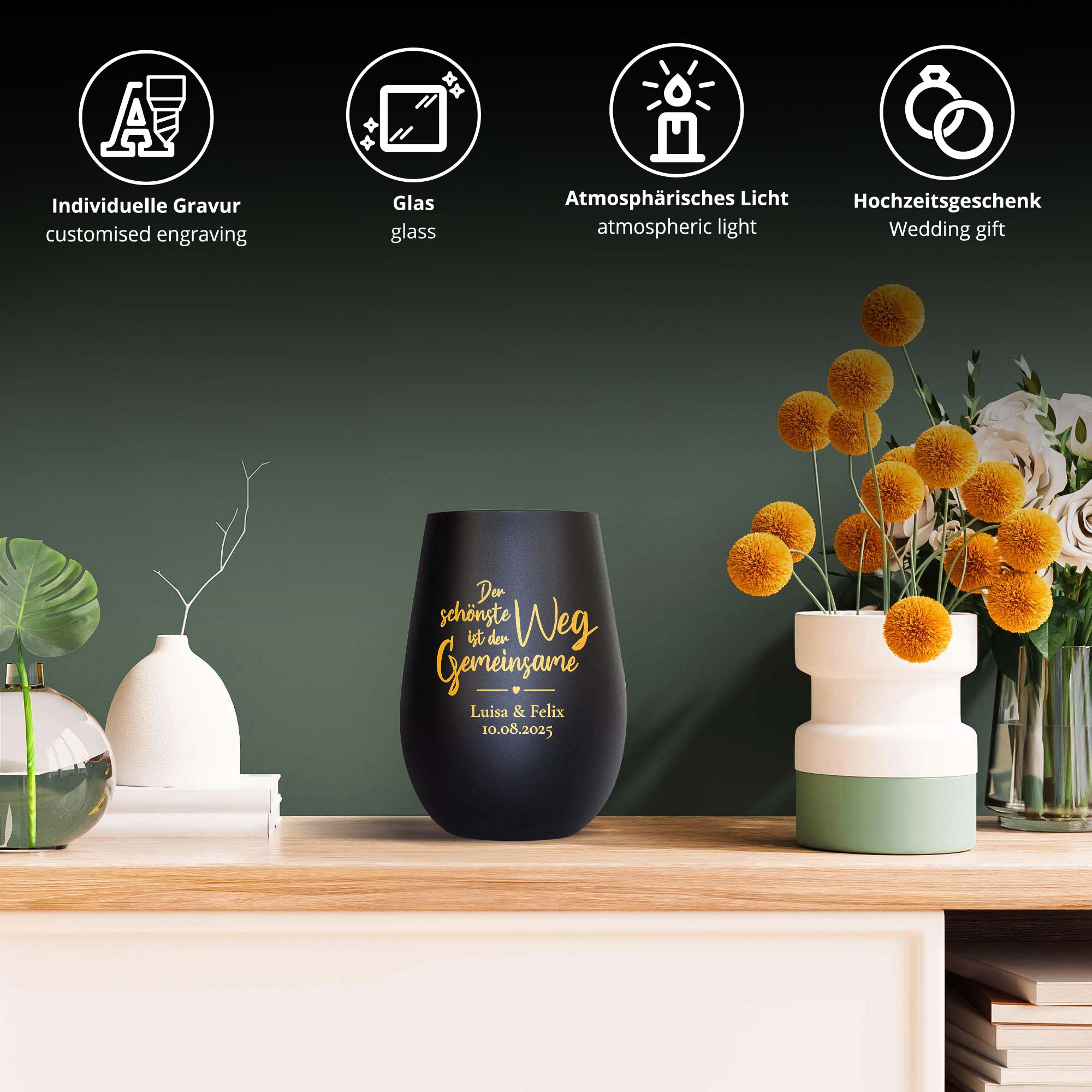 Das schwarze Windlicht ist nicht nur eine elegante Dekoration, sondern steht auch für tiefe Verbundenheit und Liebe. Mit der Gravur "Der schönste Weg ist der Gemeinsame" und den Namen des Paares wird es zu einem symbolischen Geschenk, das in jeder Wohnung einen besonderen Platz verdient. Perfekt für besondere Anlässe wie Hochzeiten, Verlobungen oder Jahrestage, ist dieses Windlicht eine stilvolle und persönliche Geste.