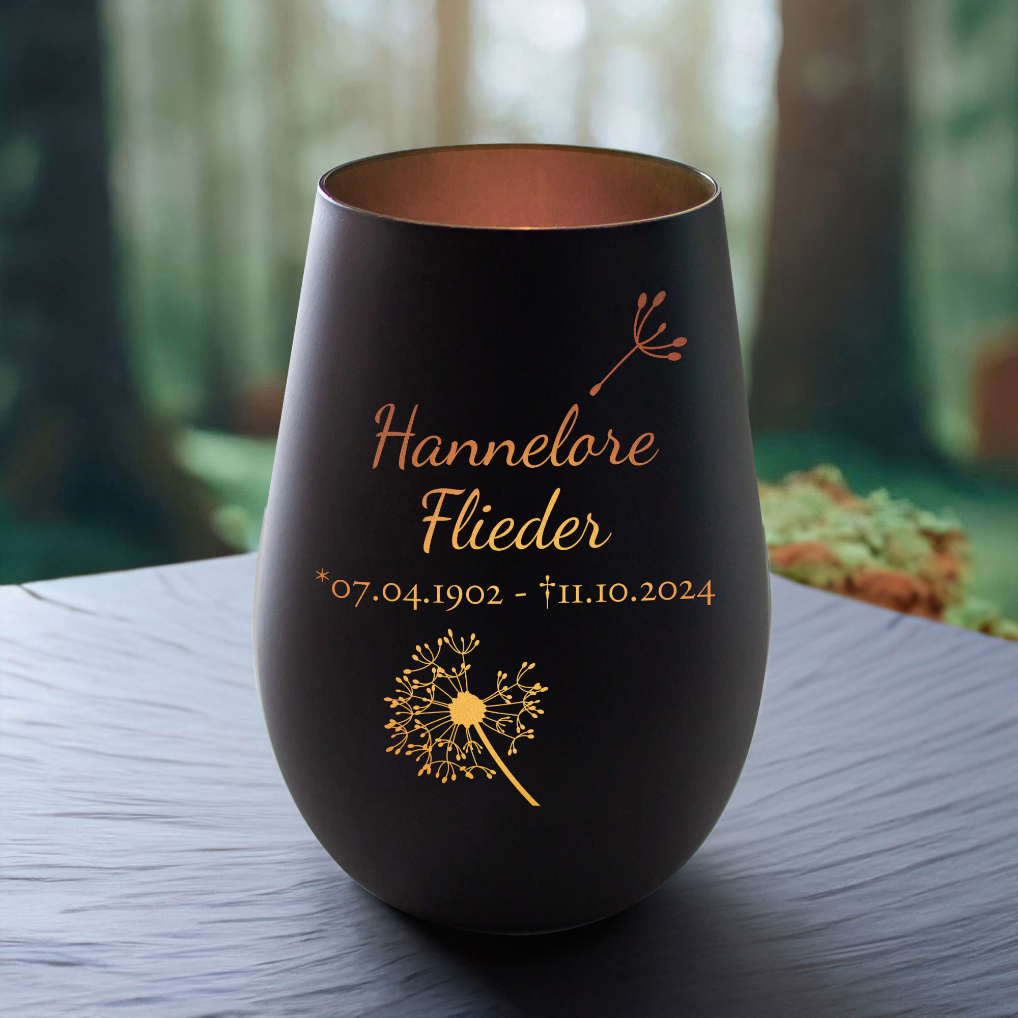 Trauer in Licht verwandeln: Der schwarze Teelichthalter mit bronzefarbener Innenfläche und zart gravierter Pusteblume ist ein einfühlsames Erinnerungsstück an einen geliebten Menschen. Das Trauerlicht Windlicht bringt stilles Gedenken und warmes Licht zusammen – ein Symbol für all das, was bleibt. Die Pusteblume steht für das Loslassen, aber auch für liebevolle Erinnerungen, die weiterleben. Dieses individuell gravierte Gedenklicht eignet sich ideal für die Gedenkecke zuhause oder als liebevoller Trostspender für Angehörige.