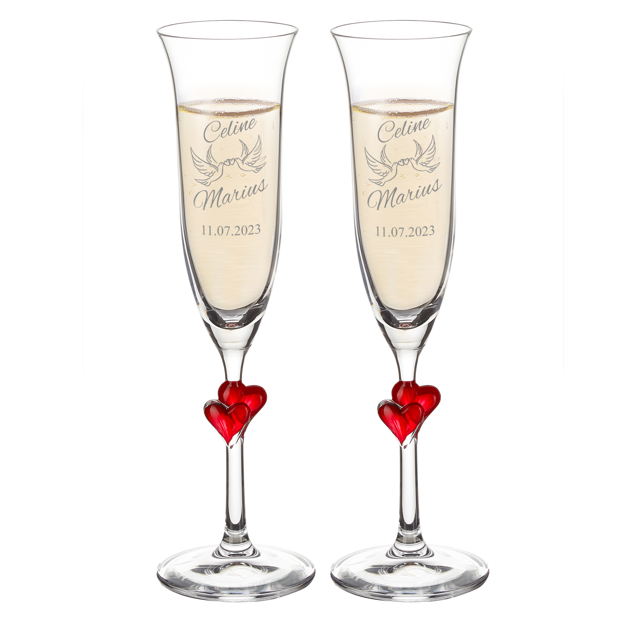 Anstoßen ist immer gut - je ungewöhnlicher desto besser, gerade wenn es um einen so feierlichen und einzigartigen Anlass wie eine Hochzeit geht. Mit unseren Design - Sektgläsern mit Gravur liegst du da auf jeden Fall richtig. Die Sektgläsern haben in ihren Stiel rote Glasherzen eingearbeitet und werden zusätzlich noch mit einer Wunschgravur der Namen und eines Datums veredelt. Außerdem kannst du aus einem von drei Hochzeitsmotiven auswählen.