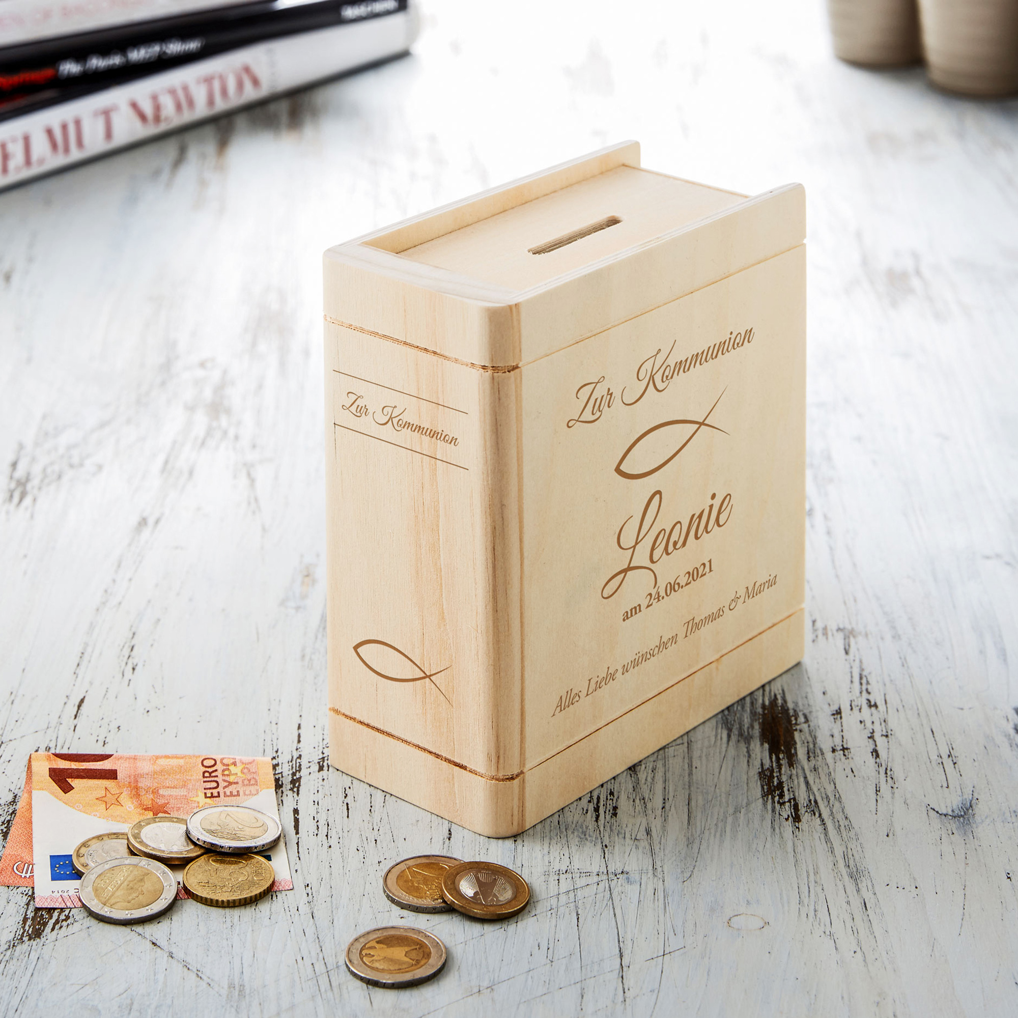 Zur Kommunion ist ein Geldgeschenk immer eine gute Idee. Wenn Jugendlichen ihre ersten Schritte in Richtung Erwachsenenleben machen, gibt es natürlich auch größere und kleinere Wünsche, die das Taschengeld übersteigen. Wer mehr als nur einen Umschlag überreichen will, für den ist die Sparbüchse in Buchform mit Gravur zur Kommunion die ideale Geschenkidee. Sie eignet sich im Anschluss perfekt, um für größere Anschaffungen zu sparen oder Geburtstagsgeld darin zu sammeln.
