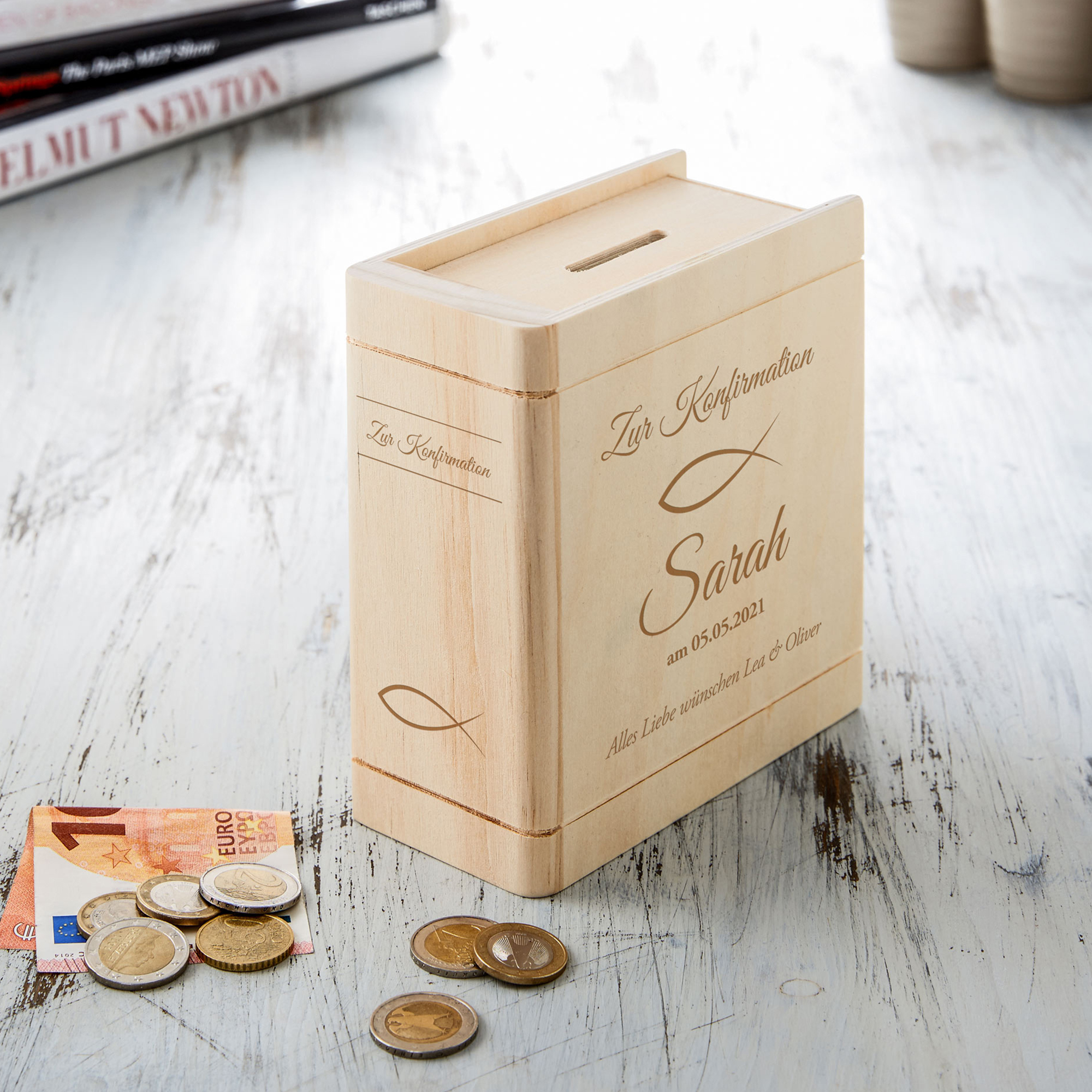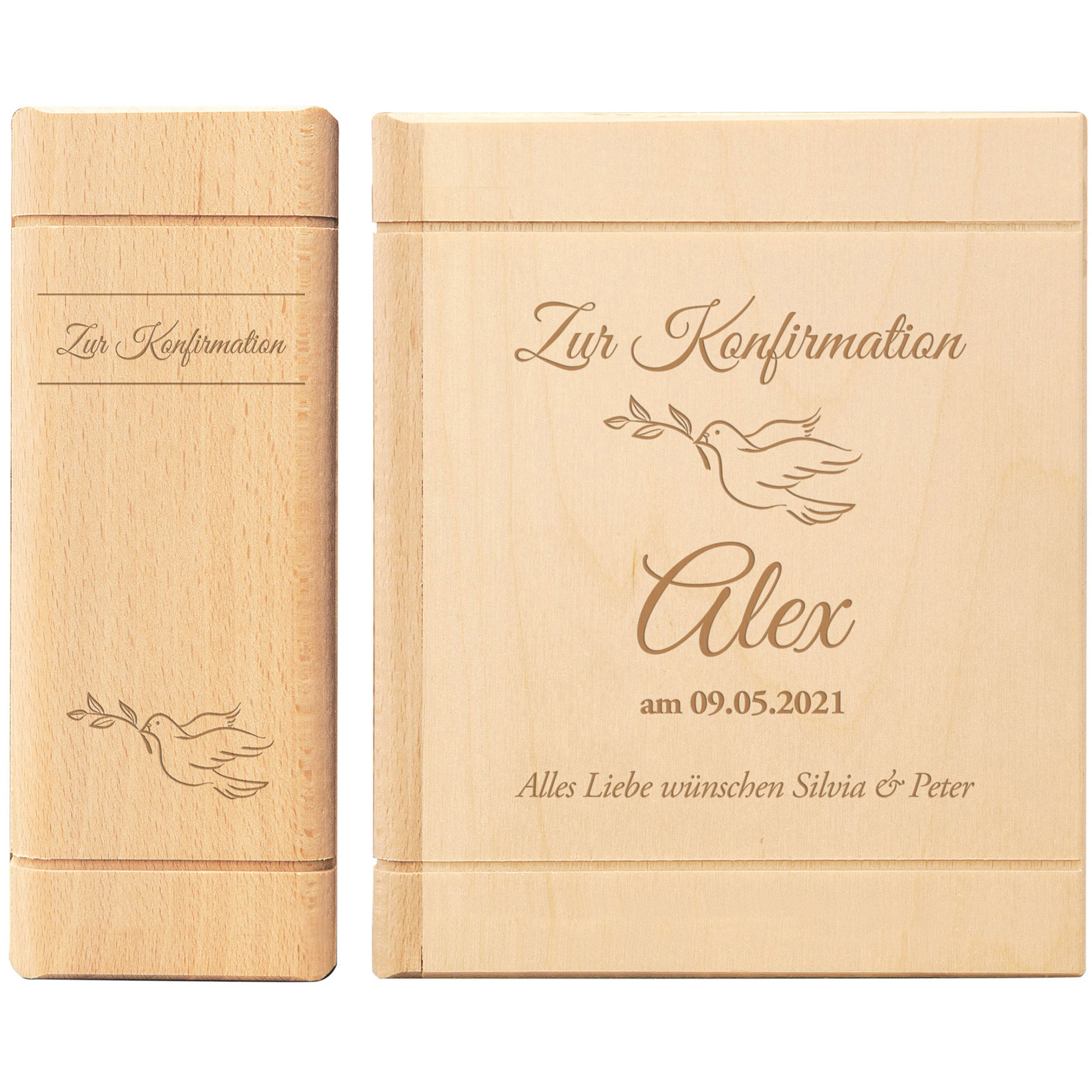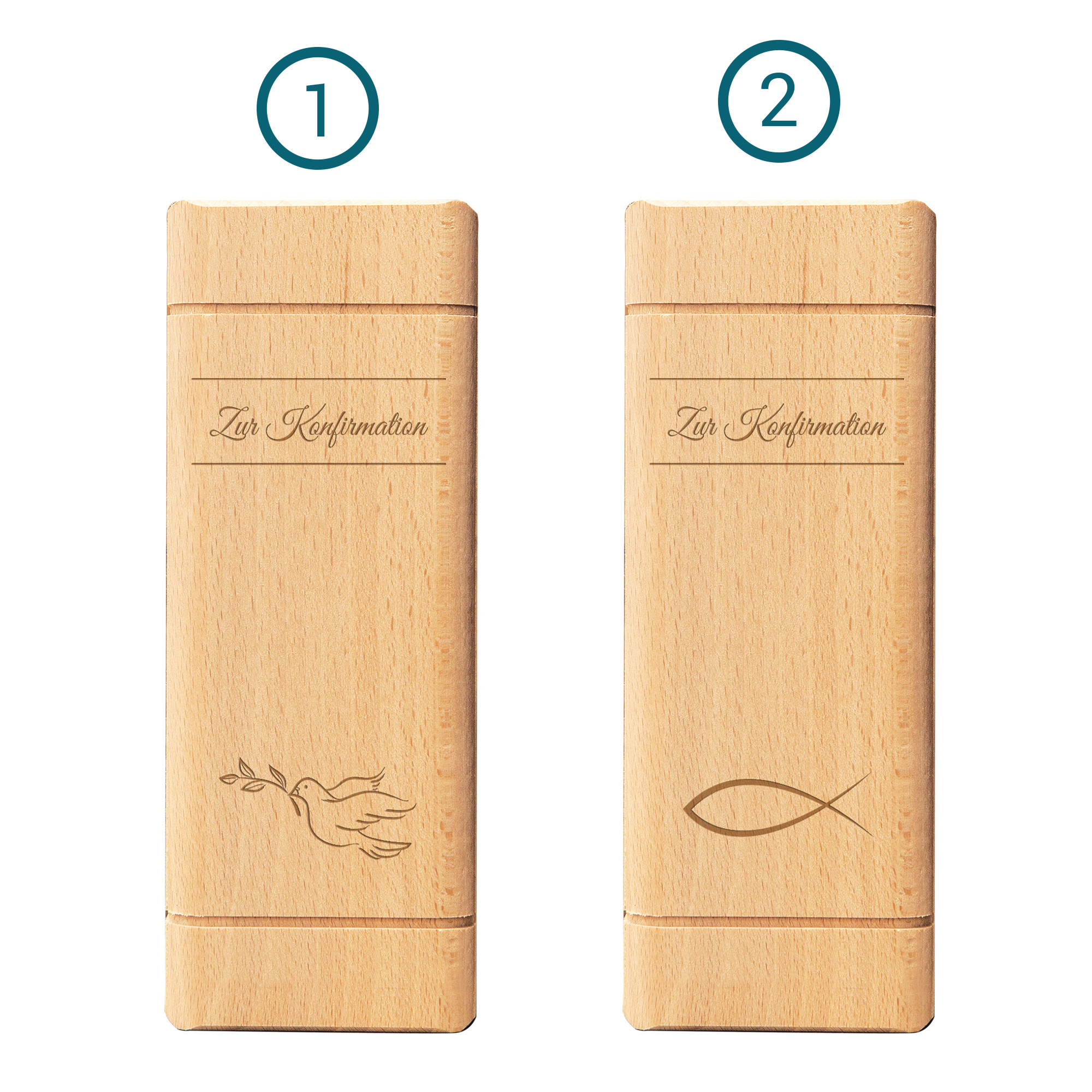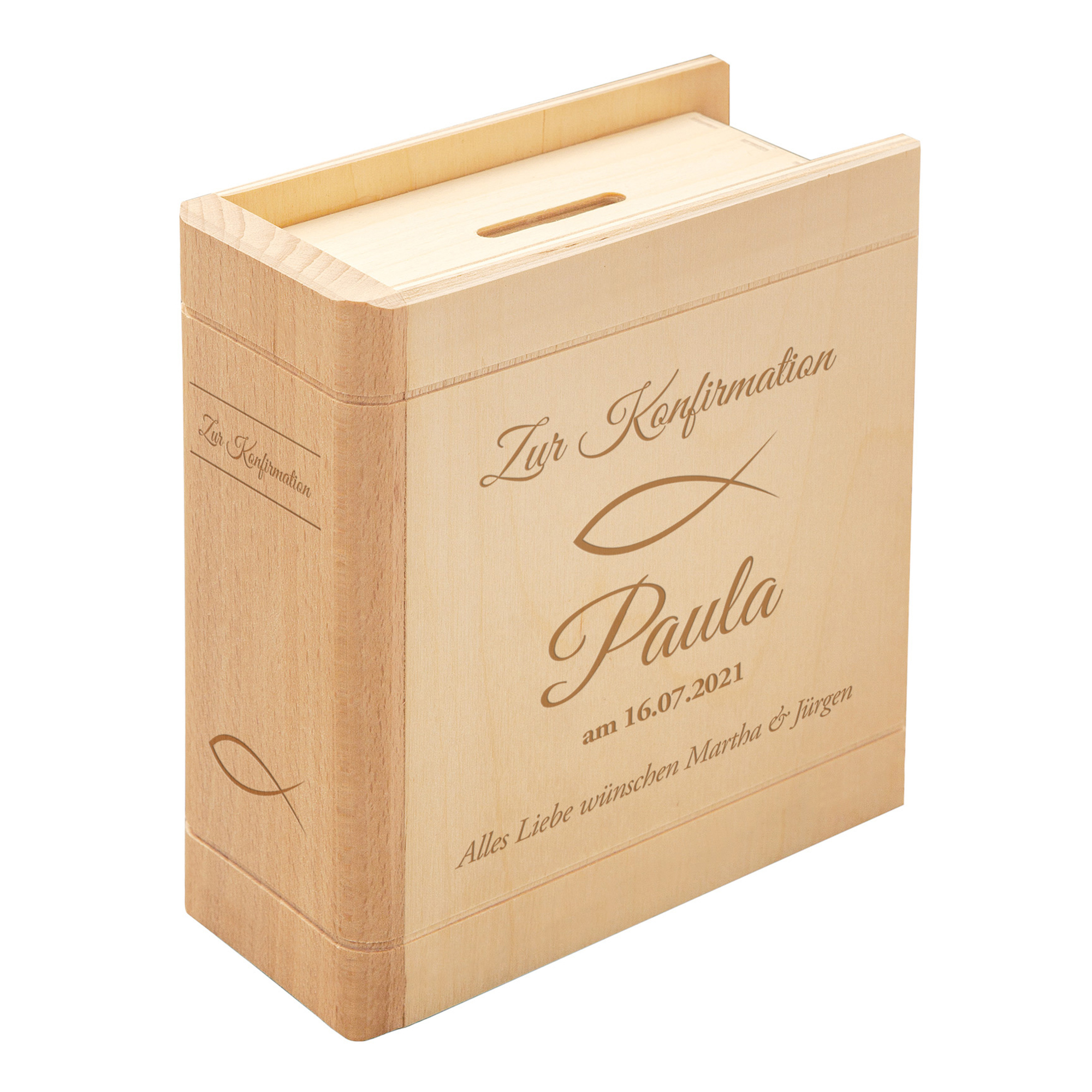 Zur Konfirmation darf ein besonderes Geschenk nicht fehlen – eines, das bleibt. Dieses Sparbuch aus Holz verbindet eine persönliche Botschaft mit einem praktischen Nutzen und wird so zu einem echten Erinnerungsstück. Die hochwertige Gravur macht jedes Exemplar einzigartig: Name, Datum und ein individueller Wunschtext verleihen dem Geschenk eine persönliche Note. Ergänzt wird das Design durch die Wahl zwischen zwei klassischen Motiven – Fisch oder Taube – die symbolisch für Glauben, Hoffnung und Gemeinschaft stehen.