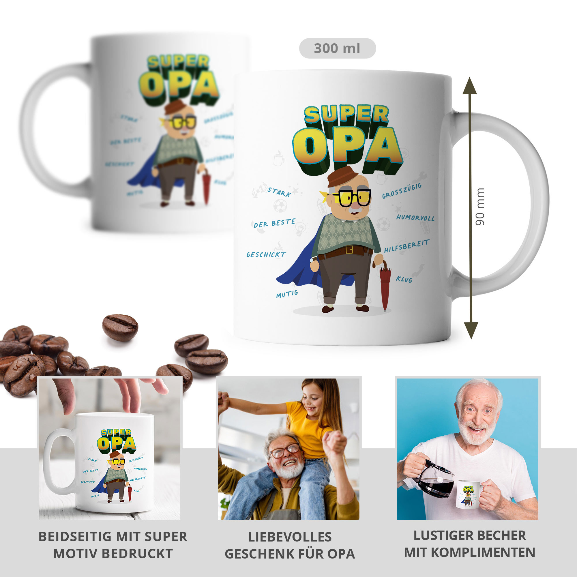 Mit seiner Geduld, den praktischen Ratschlägen und seinem allumfassenden Wissen ist Dein Opa ein wahrer Superheld. Überreiche nun den passenden Kaffeebecher mit lustigem "Super Opa" Motiv und zeige ihm Deine ganze Wertschätzung. Auf der Tasse ist ein junggebliebener Superheld abgebildet, der von liebevollen Begriffen wie "der Beste", "hilfsbereit" oder "großzügig" umgeben ist. Ein aussagekräftiges Kompliment der etwas anderen Art!