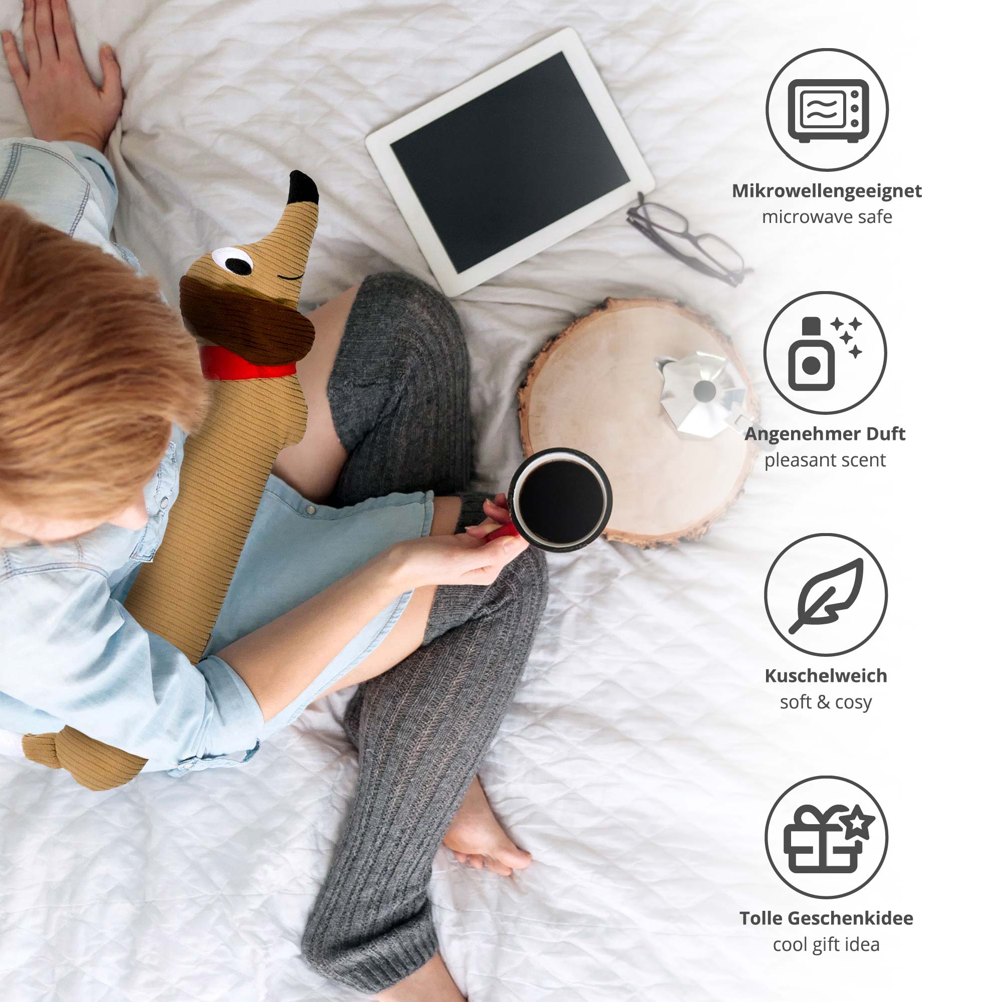 Du hast kalte Füße, einen verspannten Nacken oder einfach Lust auf tierisch süße Entspannung? Dann kommt dieser Dackel wie gerufen! Der Dackel Mikrowelle ist Dein neues Lieblingstier – weich, lang, treu und stets bereit, Dir Wärme und Entspannung zu schenken. Einfach kurz in die Mikrowelle legen und schon sorgt das Körner-Innenleben mit Lavendelduft für wohltuende Momente. Ob auf dem Bauch, im Nacken oder einfach zum Knuddeln – dieser Dackel ist der beste Wärmespender der Welt!