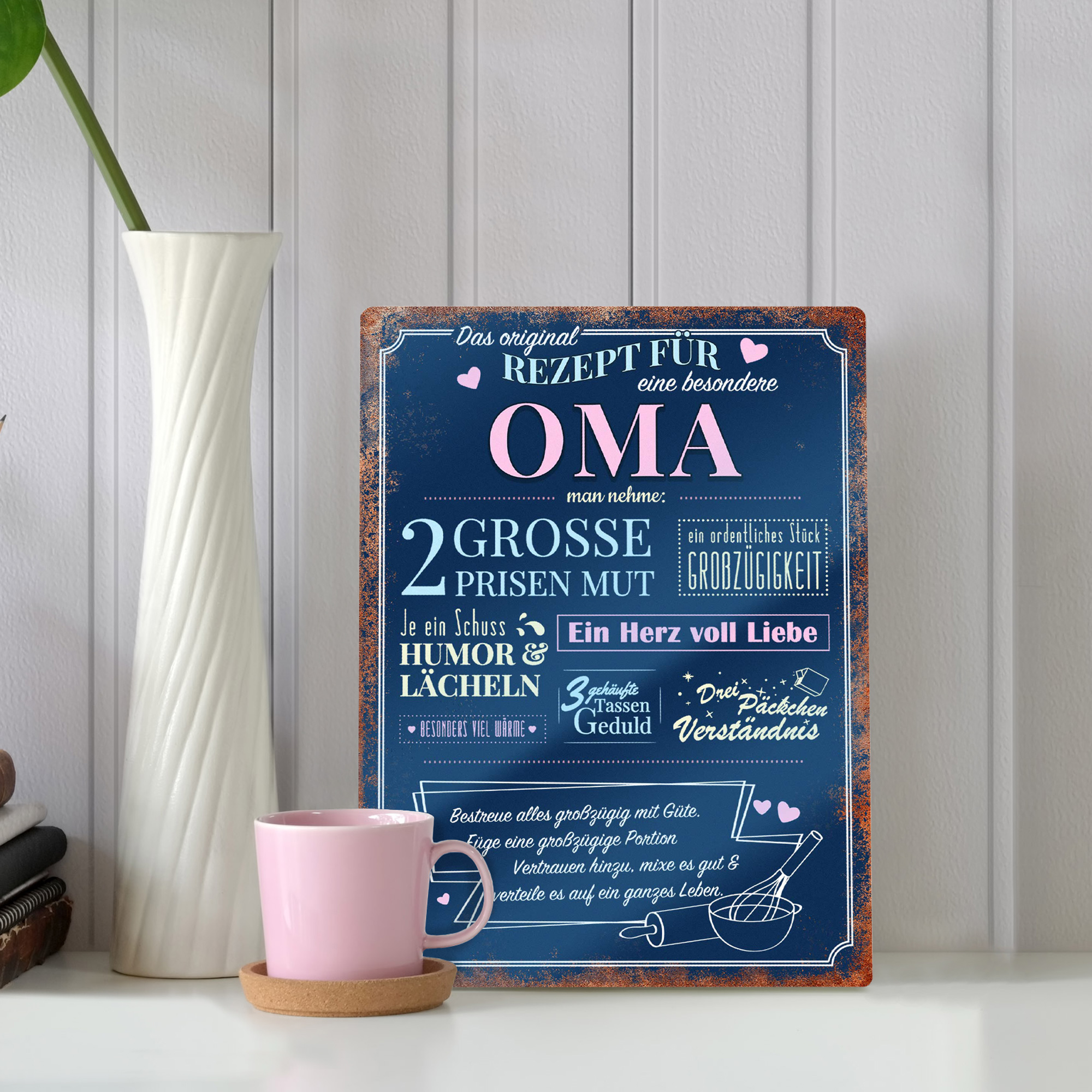 2 große Prisen Mut und ein ordentliches Stück Großzügigkeit sind nur zwei der zahlreichen Eigenschaften die Oma auszeichnen. Mit dem Wandschild wird Oma immer daran erinnert, wie wichtig sie ihren Kindern und Enkelkindern ist.