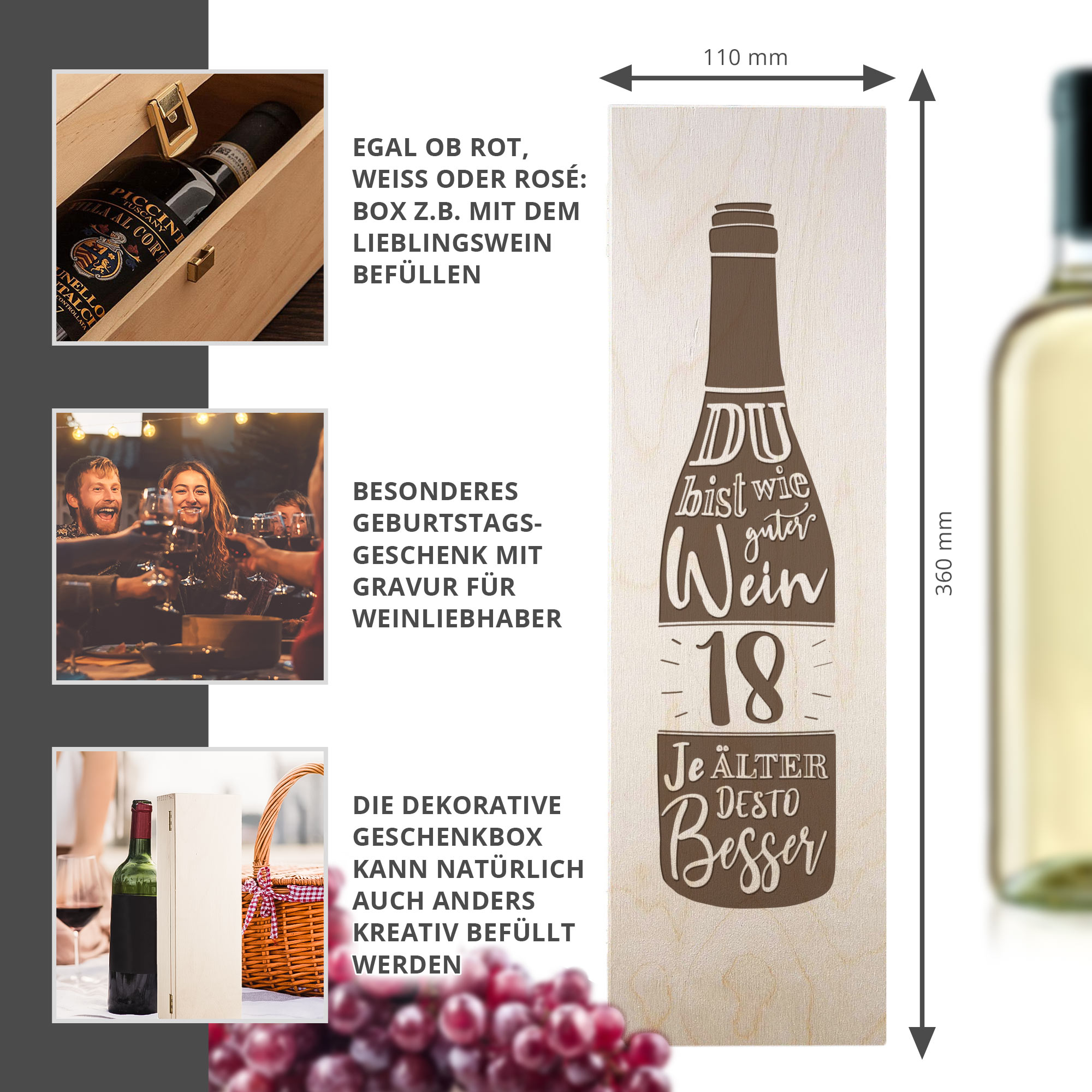 Gestalte eine einzigartige Geschenkkiste zur Volljährigkeit! Befülle die Weinkiste aus Holz mit einem guten Tropfen oder verstaue Kleinigkeiten wie Süßigkeiten, Bilder und Erinnerungsstücke in der schmalen Geschenkkiste.