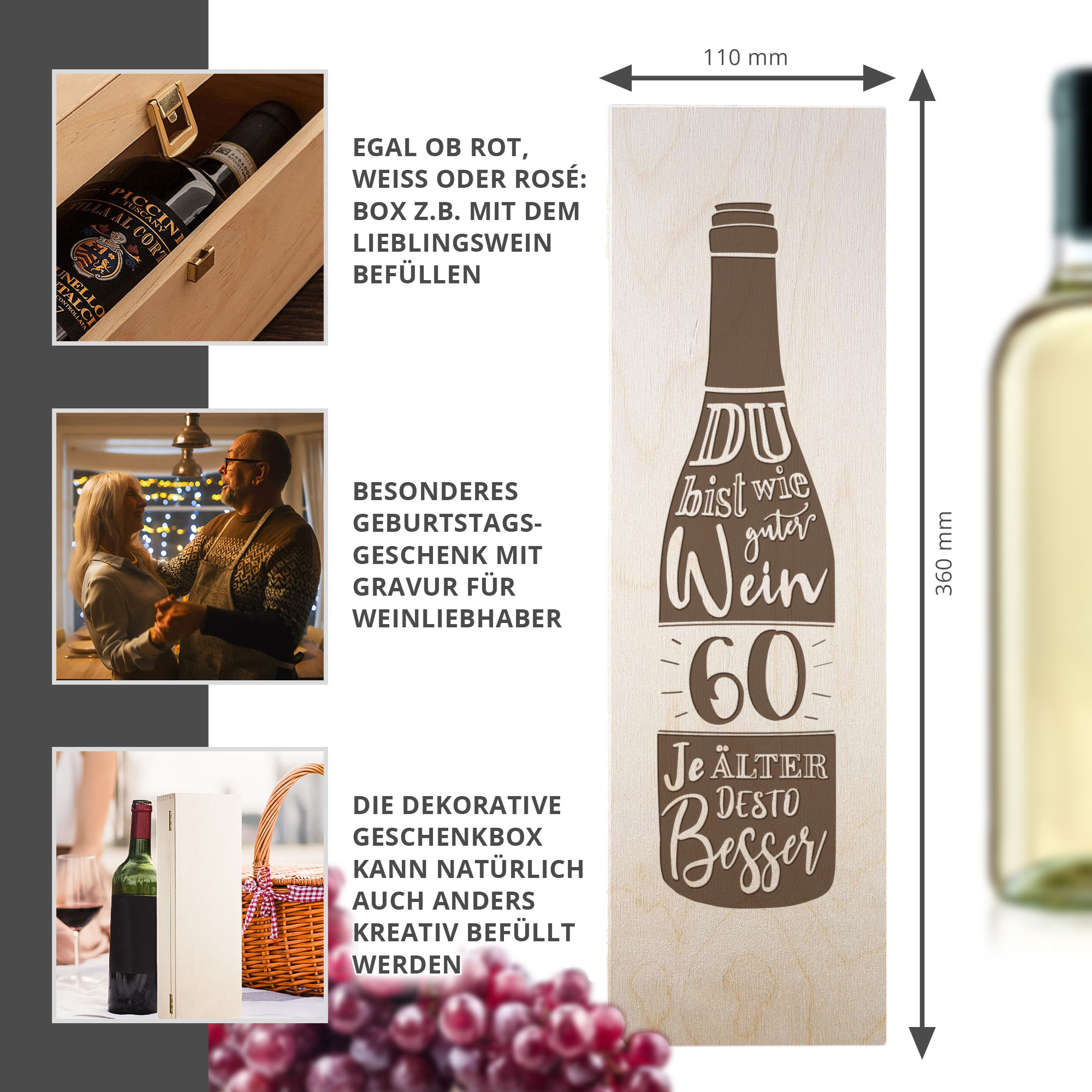 Lege persönliche Botschaften oder Gutscheine bei und überrasche das Geburtstagskind zum 60. Jubiläum mit einer persönlichen Wein Aufbewahrungsbox inklusive der Gravur "Du bist wie guter Wein - Je älter desto besser" auf dem Deckel.
