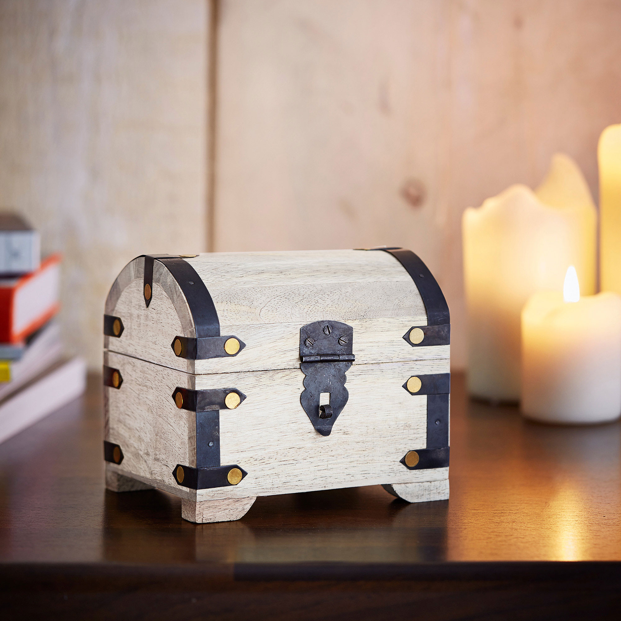 Mit der einzigartigen Geschenkkiste im klassischen Piratenschatz Look und schlichtem Design in hellem Weiß holst du dir rustikalen Piraten-Charme in jedes Ambiente.