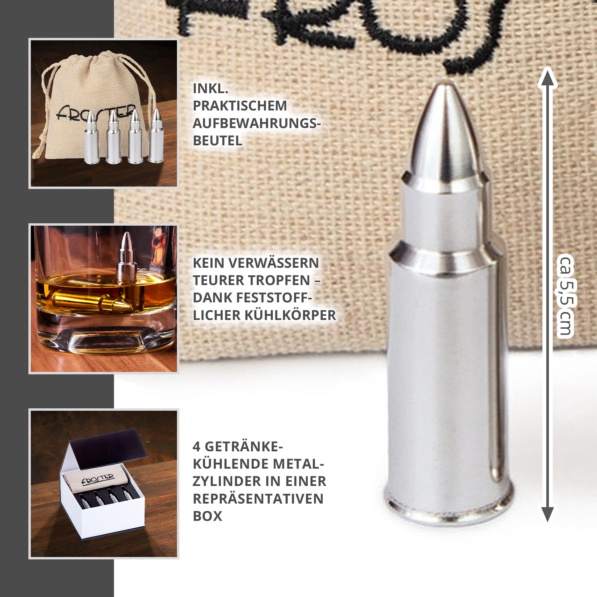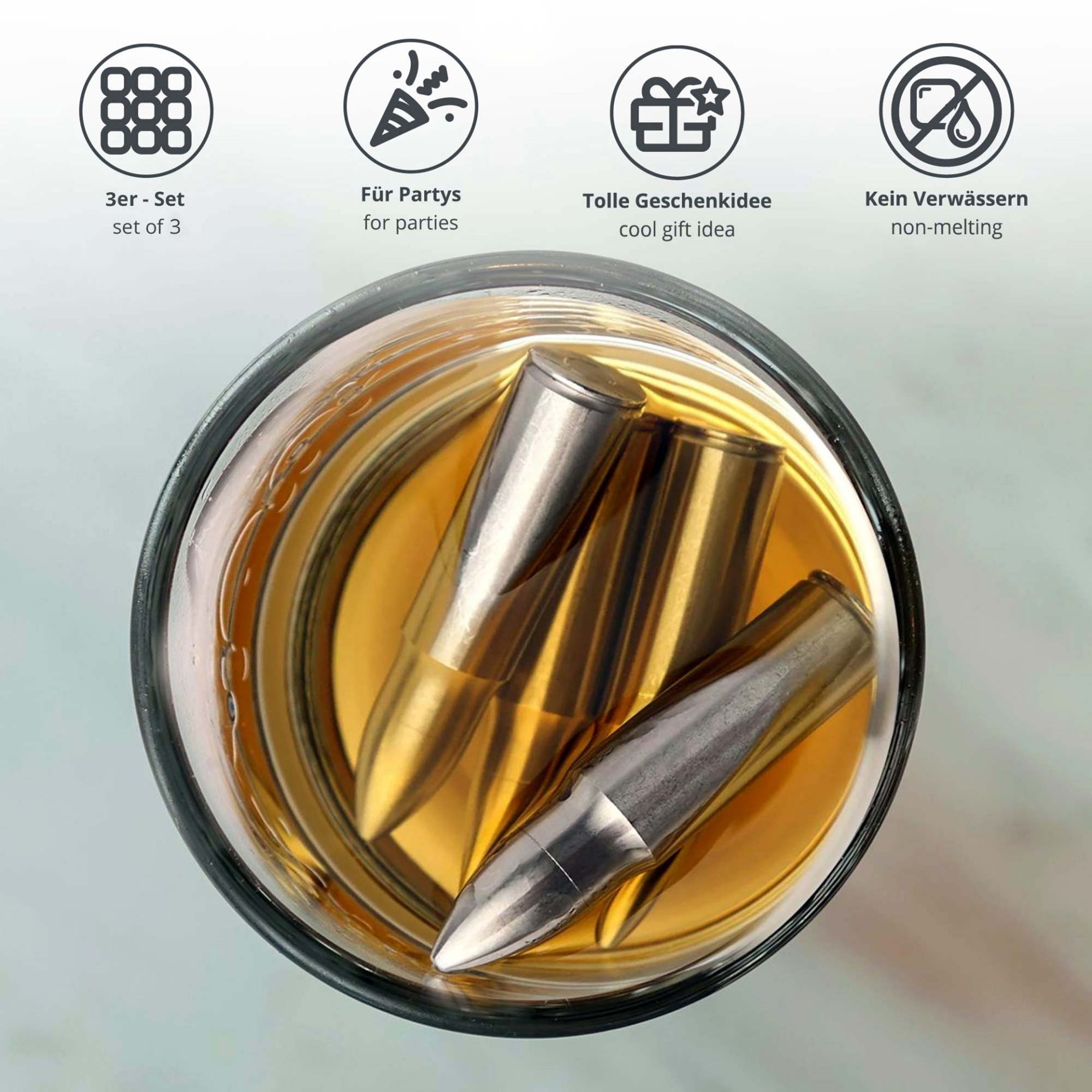 Denn nicht nur kannst du die wiederverwertbaren Patronen Eiswürfel immer wieder benutzen - sie bestehen auch aus Metall und haben die Form von Patronen. Die Metallhülle der Eiswürfel ist dabei gefüllt mit einer Flüssigkeit - lege sie einfach ins Kühlfach und schon sind sie bereit, deinen Drink zu kühlen. Die originelle Patronenform macht die Eiswürfel zu einem perfekten originellen Geschenk für alle, die es lieben, kühle Getränke zu genießen. Perfekt als Geschenk zum Geburtstag oder als Geschenkidee zum Einzug oder Umzug.