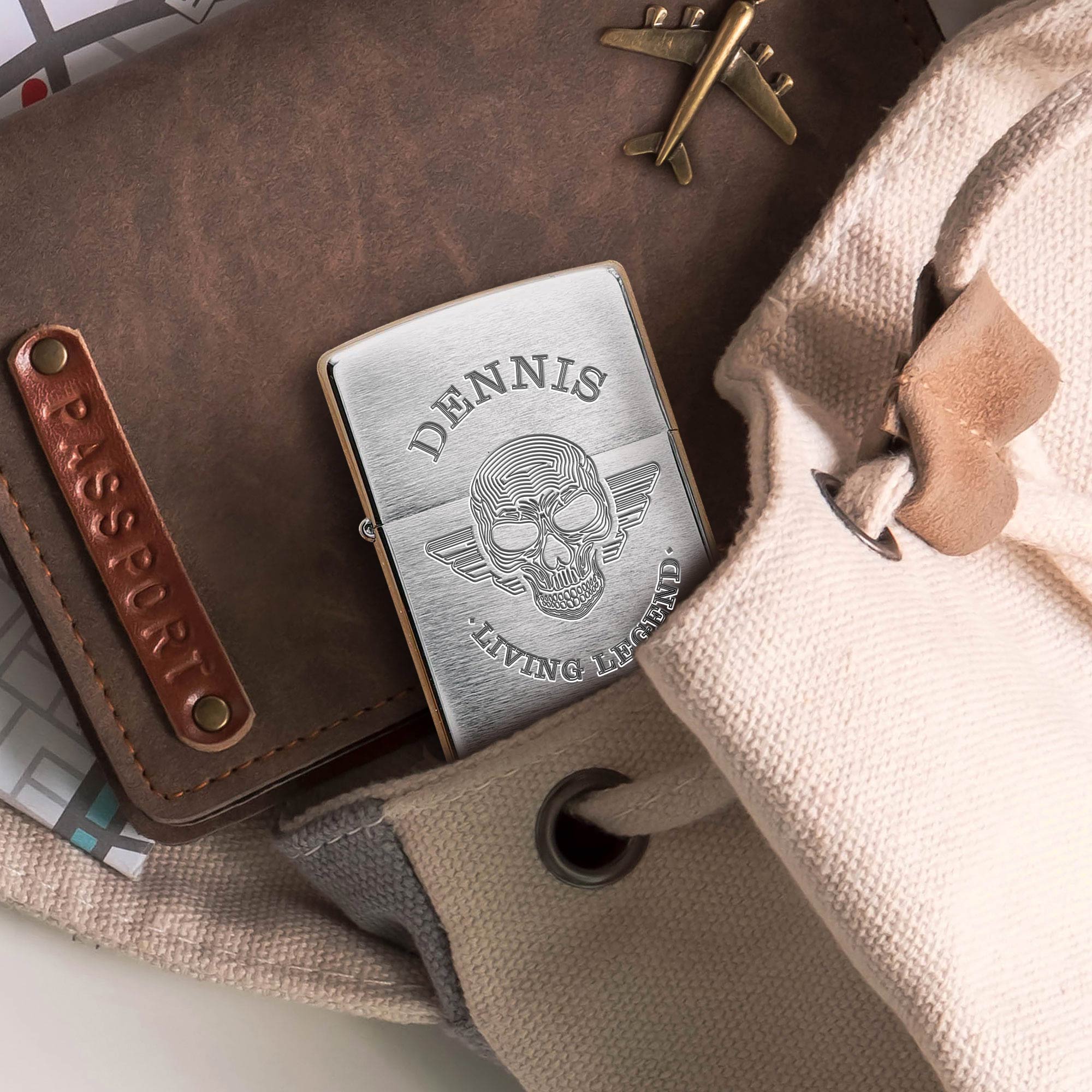 Entdecke mit dem personalisierten Sturmfeuerzeug die ausgezeichnete Qualität. Auf dem Zigarrenfeuerzeug wird ein Totenkopf Motiv mit "Living Legend" Schriftzug und ein individueller Name verewigt.
